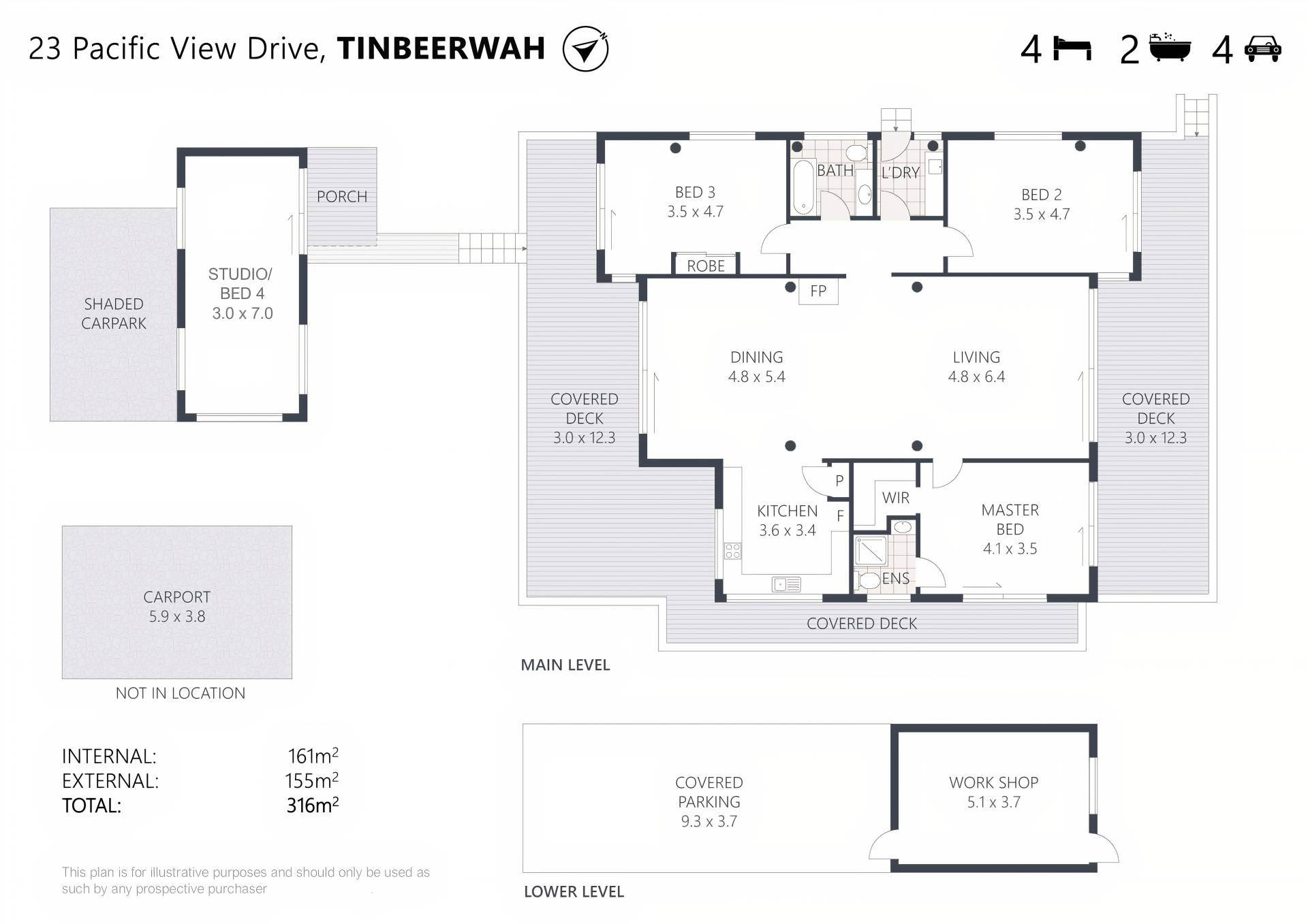 For those with caravans, boats or trailers, a high-roofed carport provides excellent covered parking and there is a handy additional shade-sailed parking space to one side of the studio.