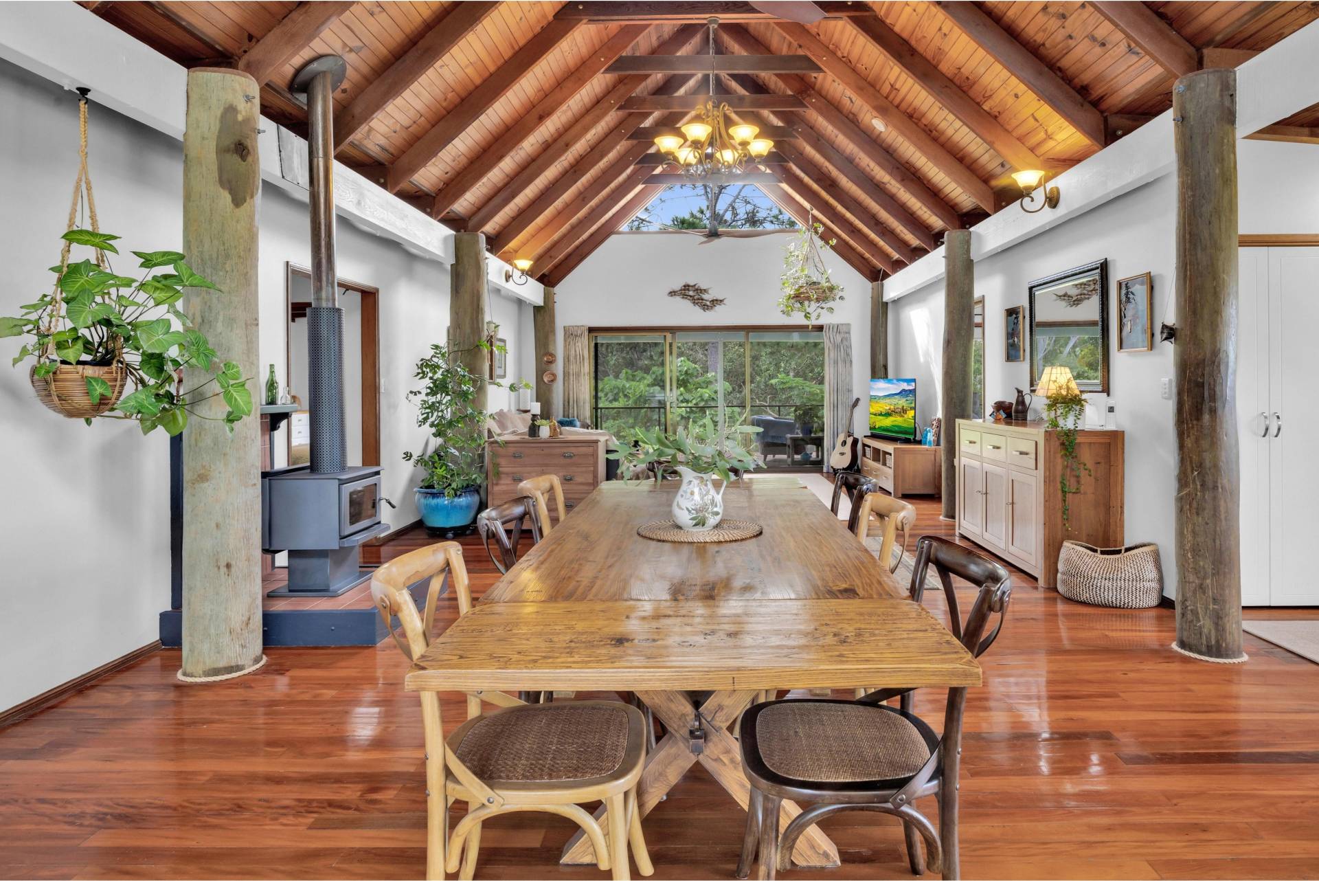 The spacious central living and dining space, with its solid timber supports and high-raked ceilings, boasts a wood-burning stove and leads out to the decks on two sides through sliding glass doors.