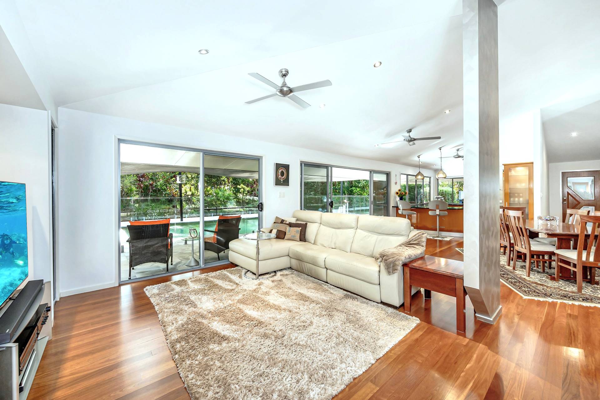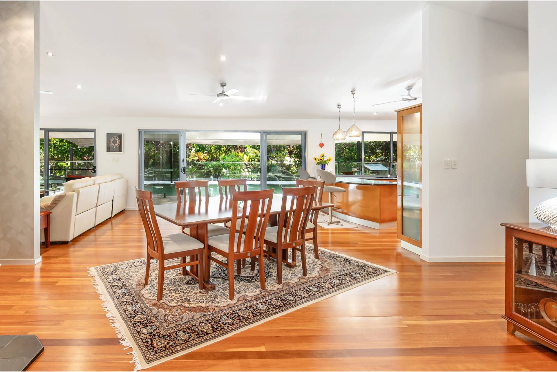 It flows out to an expansive stone-paved front verandah and 10m saltwater pool with shade sail - the perfect place to entertain through the warmth of the Sunny Coast summer.
