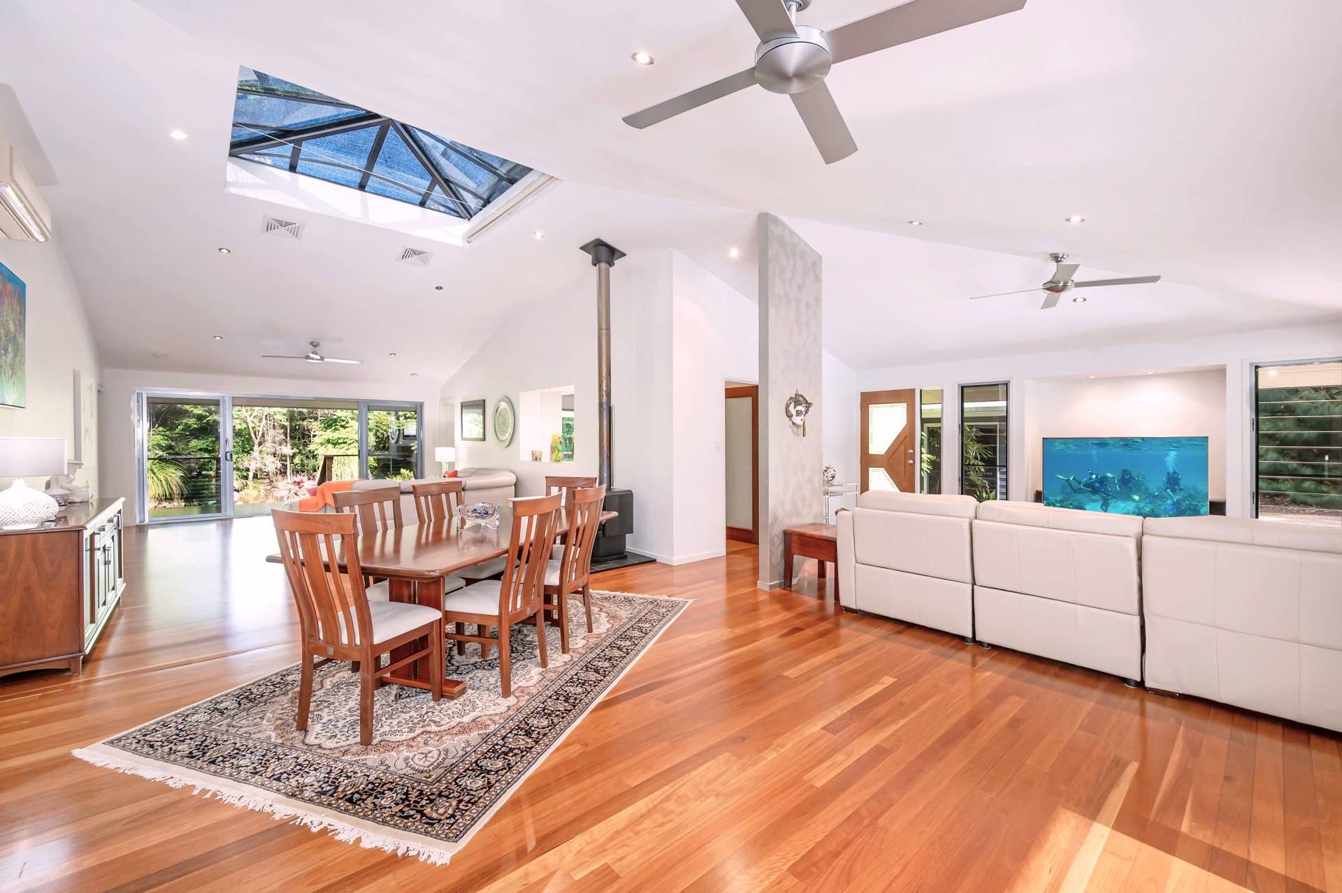 - Spacious living/dining area with polished timber floorboards, wood-burning fire, 4.5m raked ceilings, feature skylight