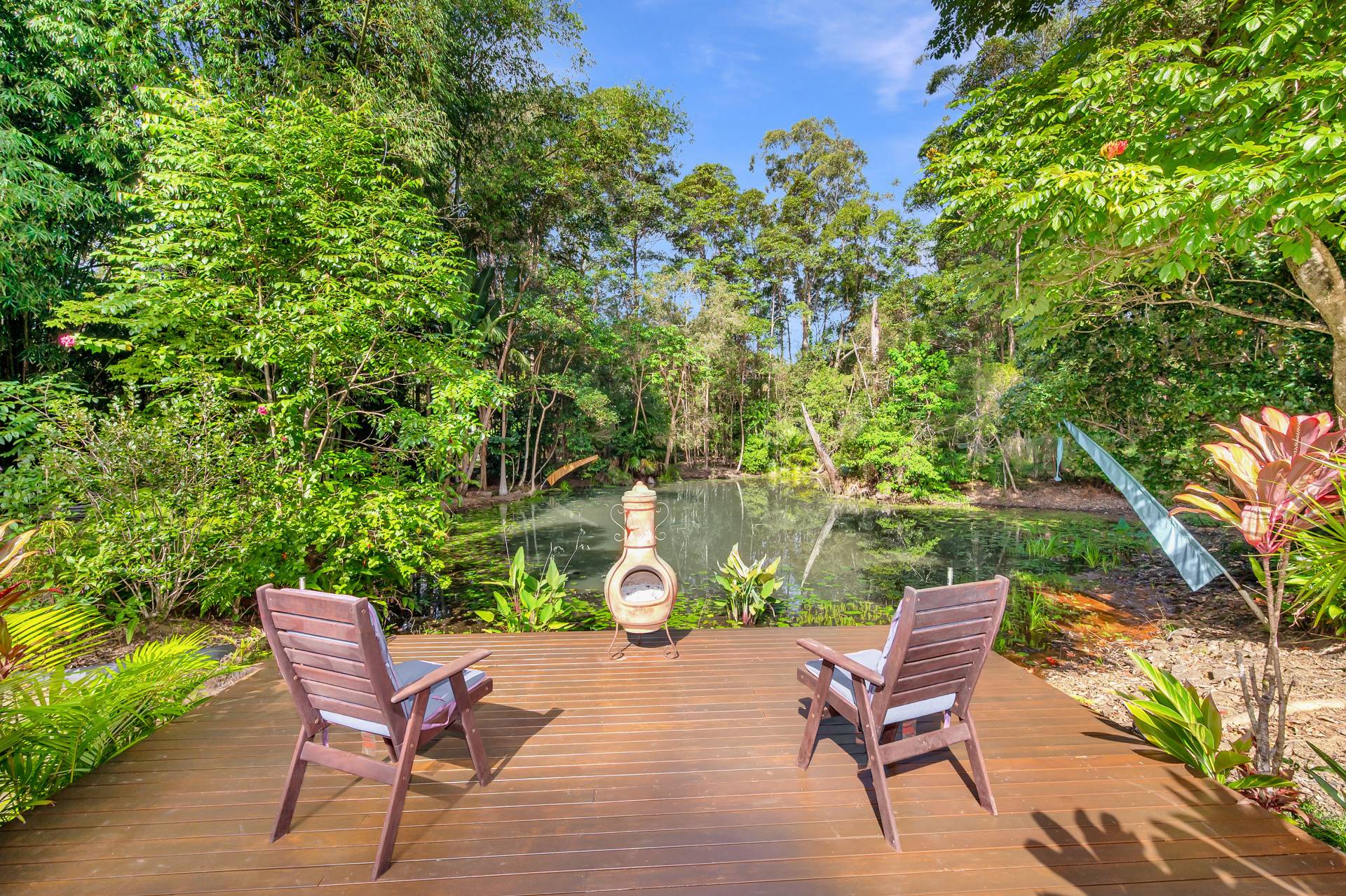 At the rear of the home, another substantial shaded deck provides more entertaining space, this time overlooking a gorgeous natural dam and jetty surrounded by native planting.