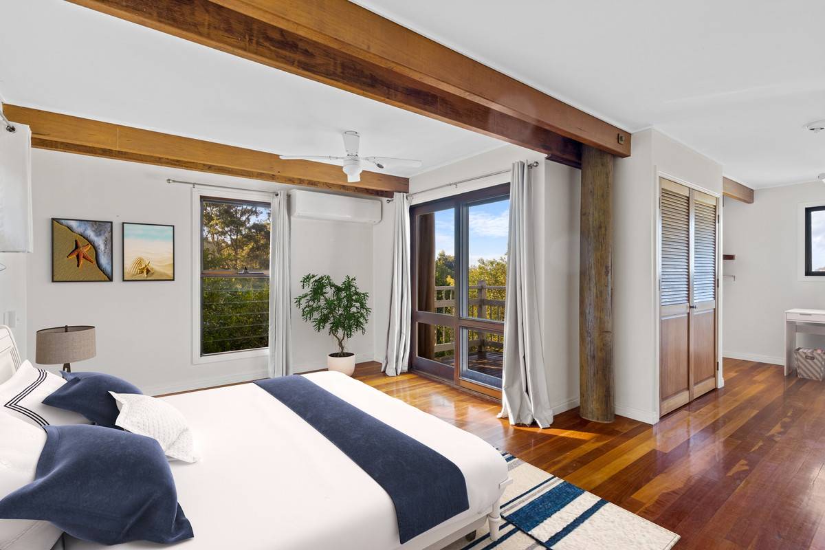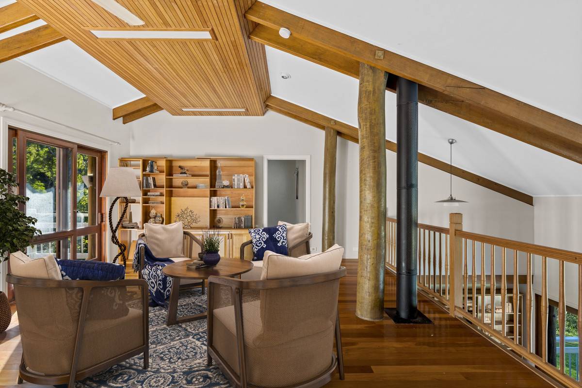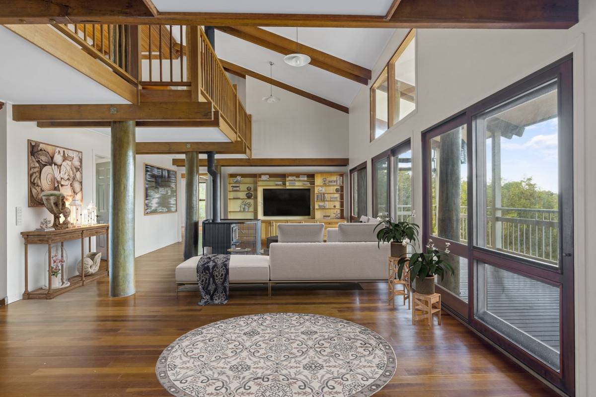 Timber floors and supports feature throughout the home, with generous verandahs on each level providing perfect vantage points across the surrounding environs.