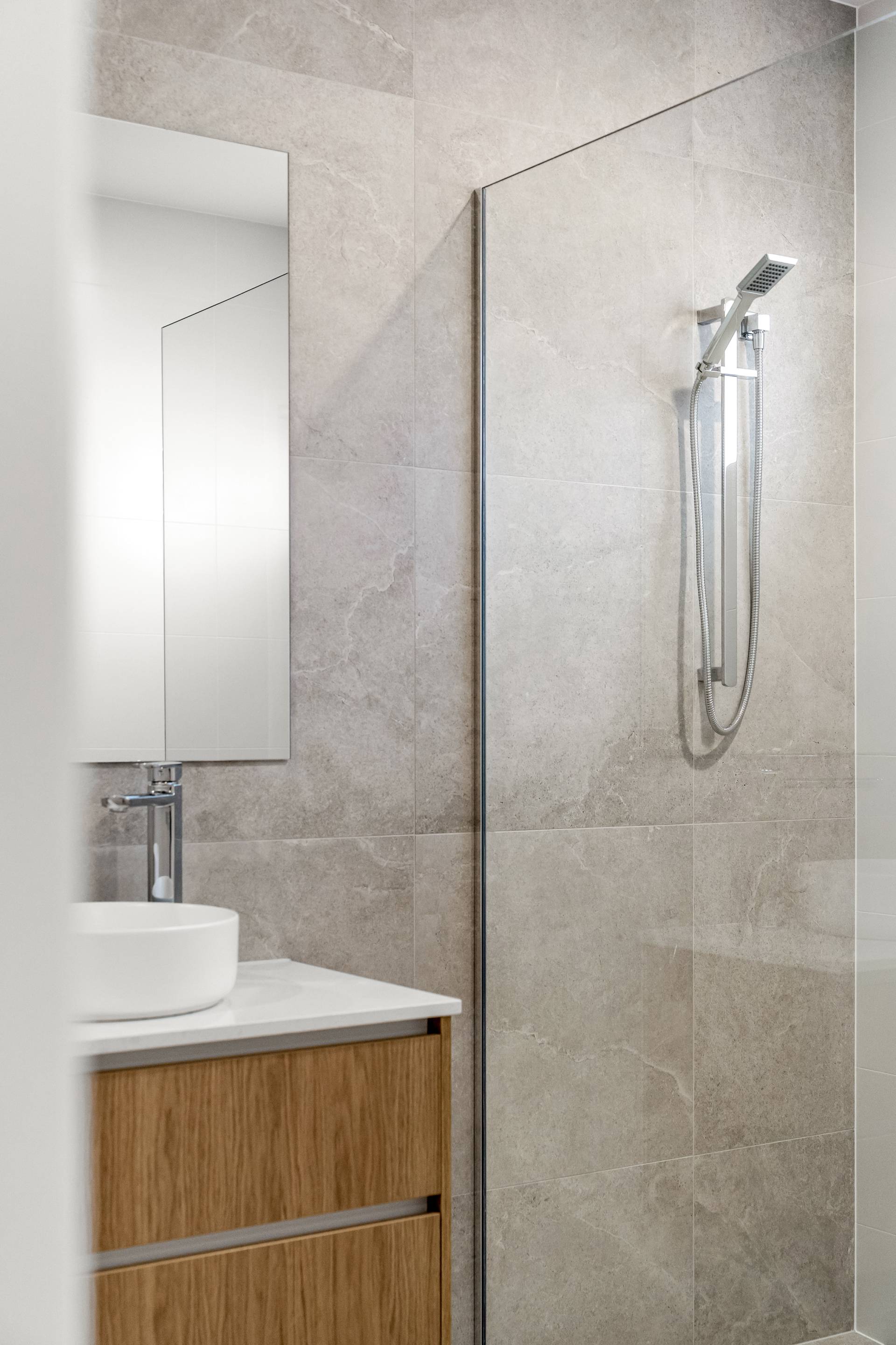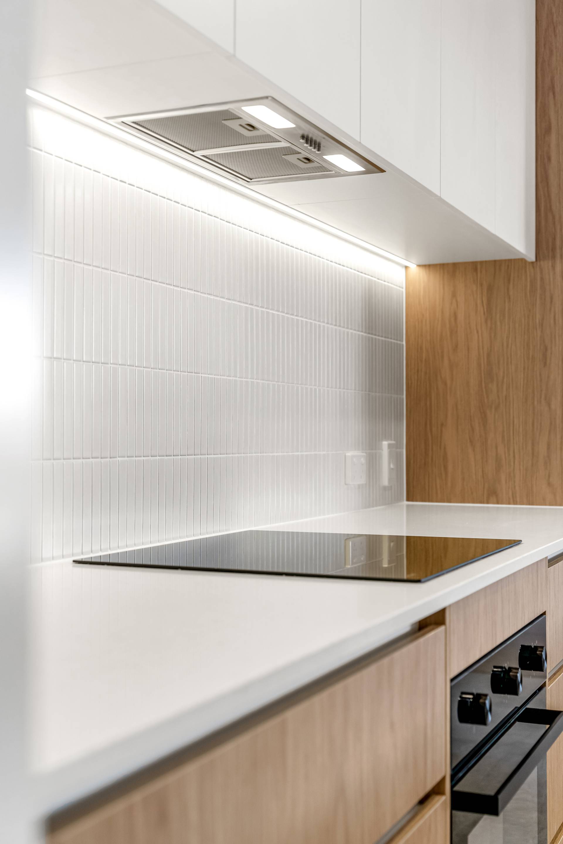 • Beautifully appointed kitchen with integrated dishwasher, ample storage, and stone waterfall bench