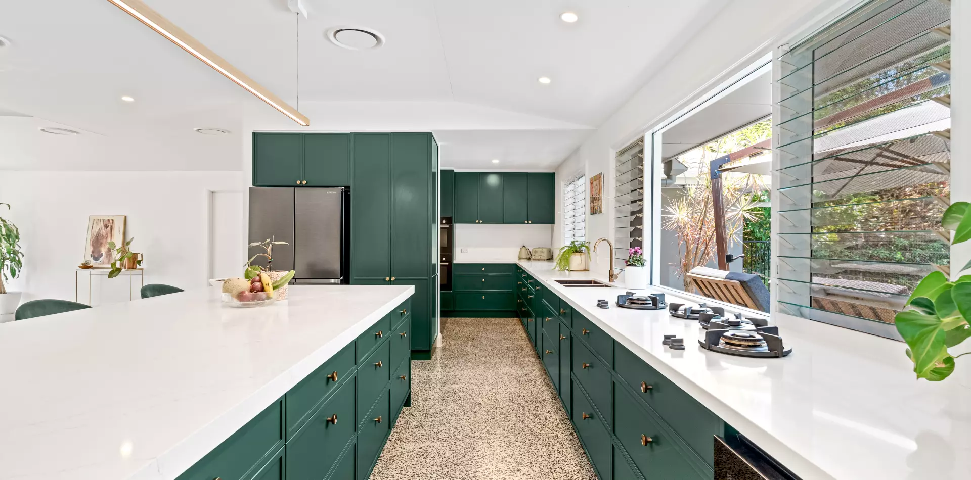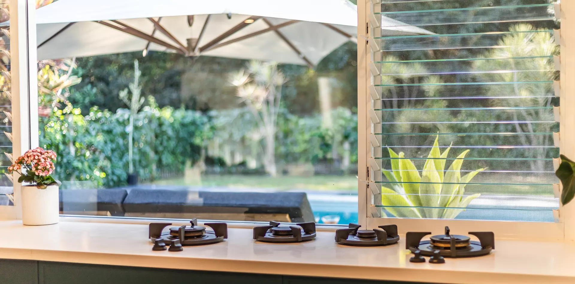 - Stunning Gull Design kitchen overlooking pool, with large butler's pantry/laundry, huge Caesarstone sit-up island, 4 x PITT gas burner cooktop, Bosch Series 6 double ovens and integrated dishwasher, undercounter wine fridge