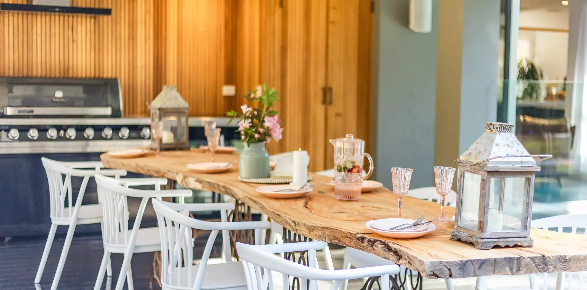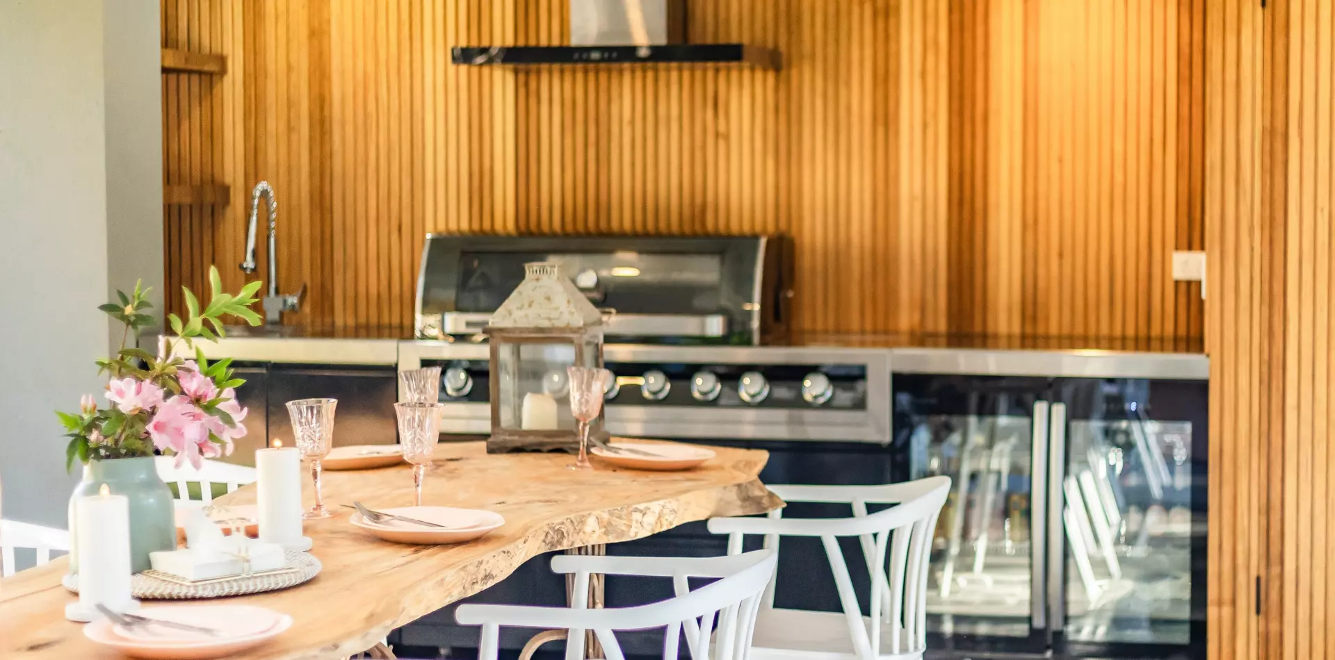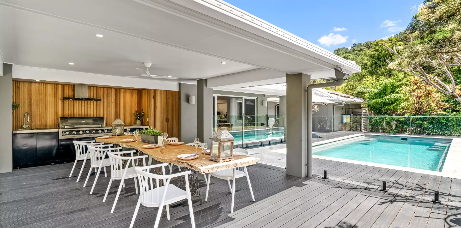 - Extensive covered entertaining deck with ceiling fans and fitted external kitchen