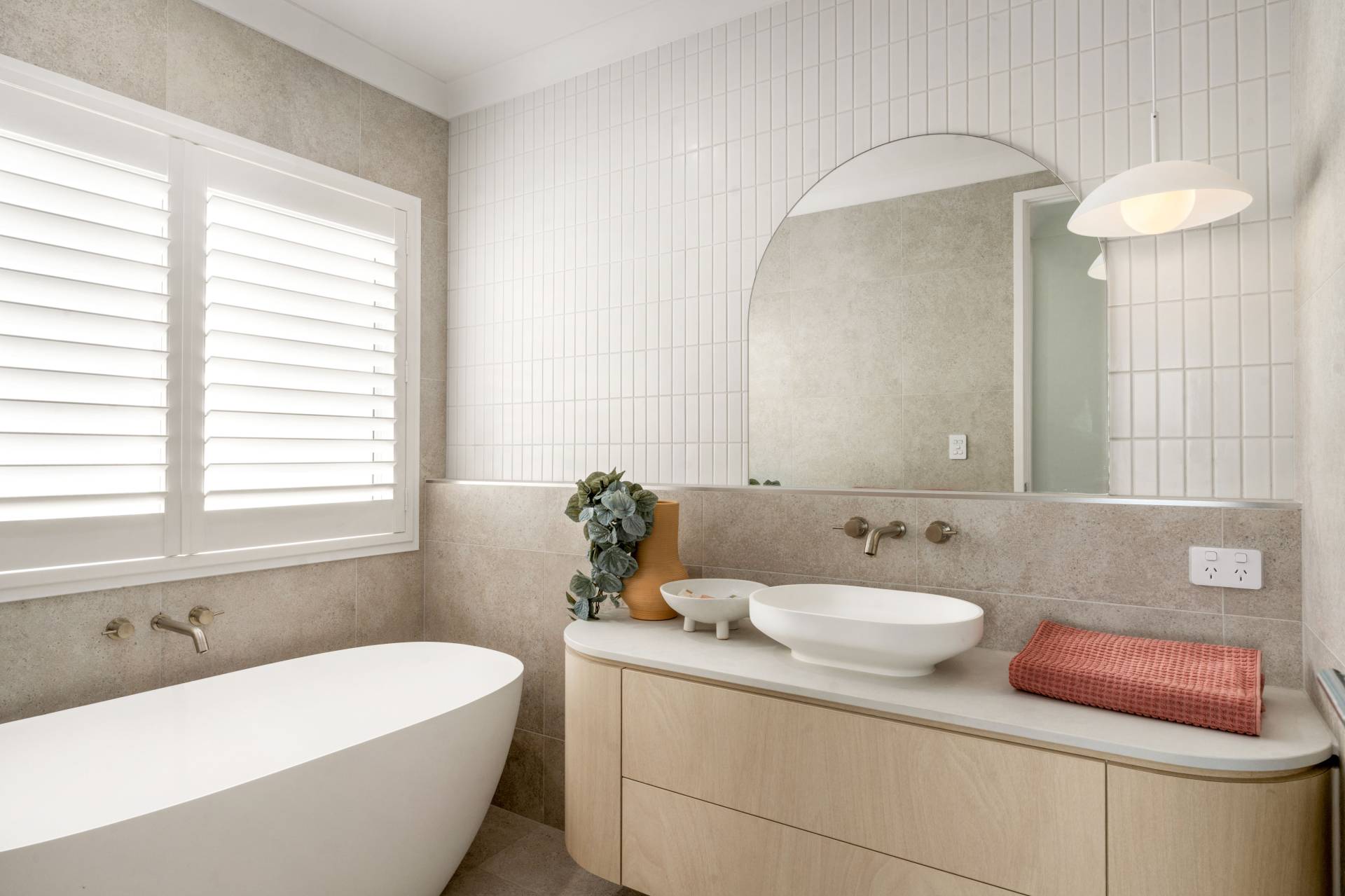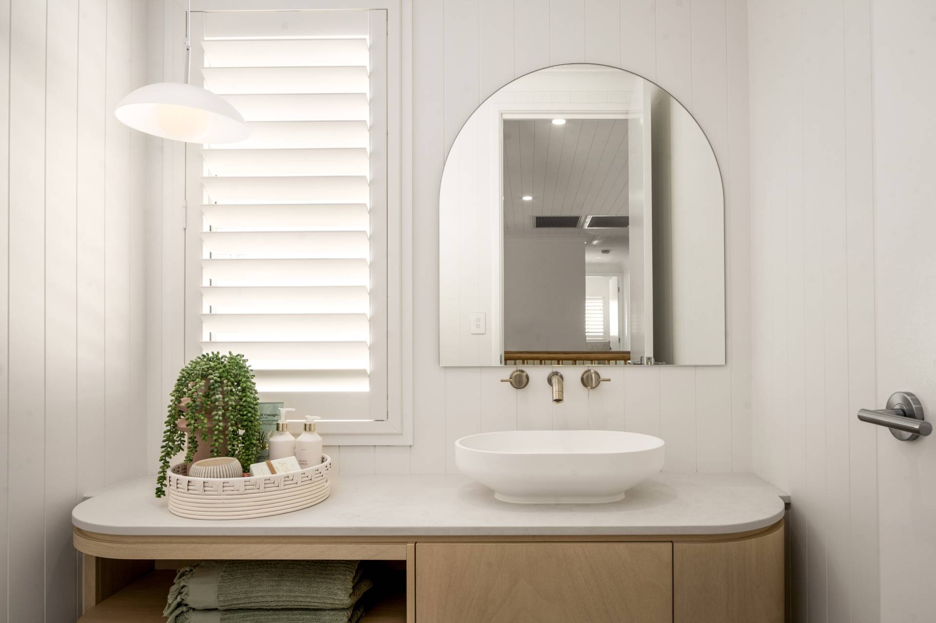 • Powder room with bespoke cabinetry, feature mirror, and VJ panelling