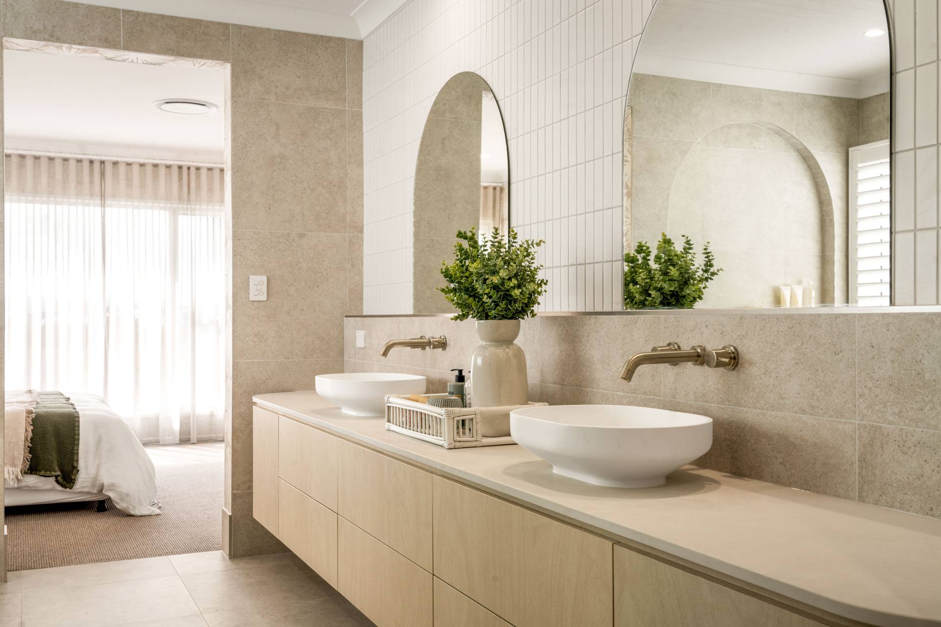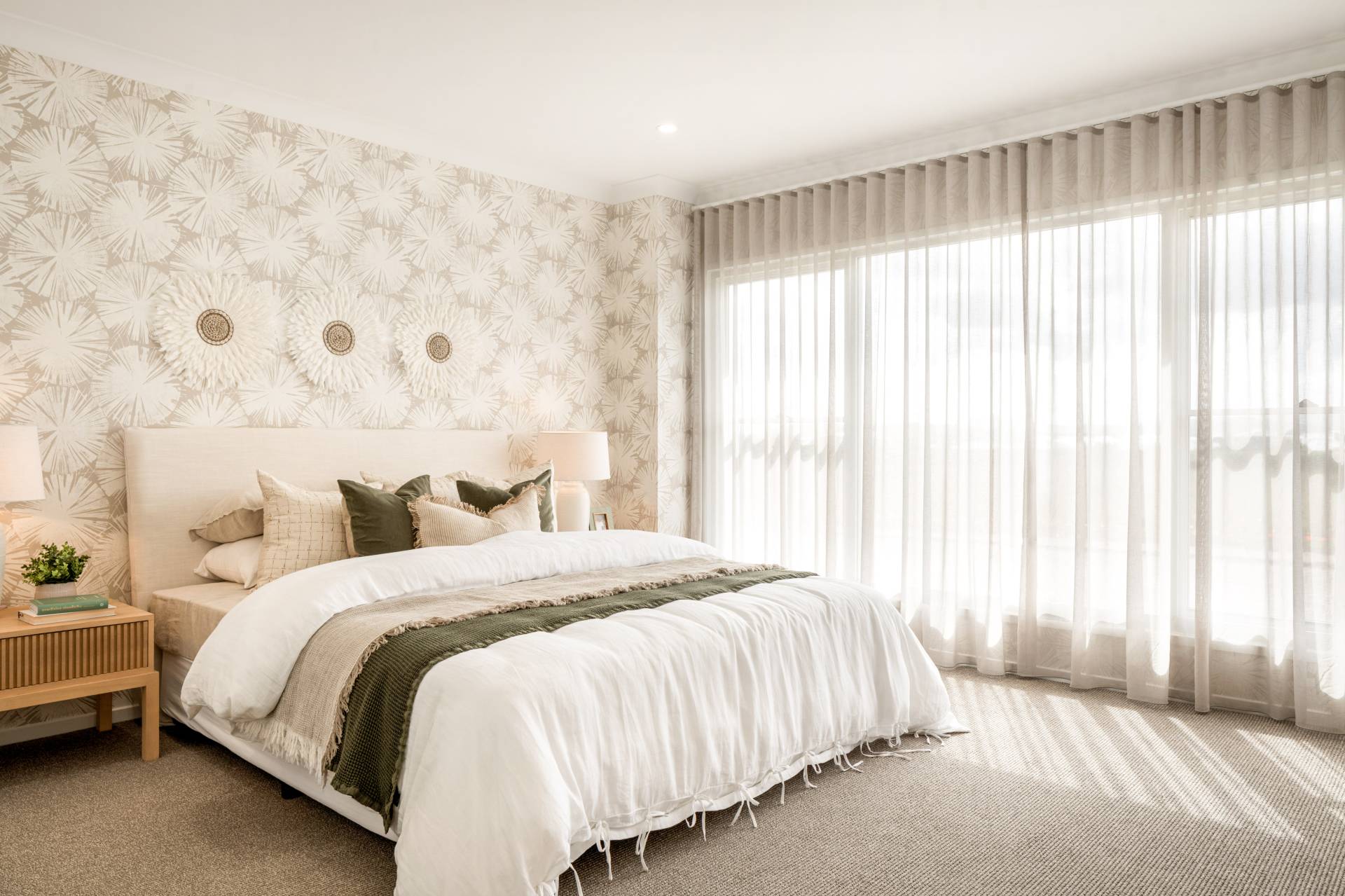• Master bedroom with feature walls, floor-to-ceiling sheers, ensuite, and walk-in robe