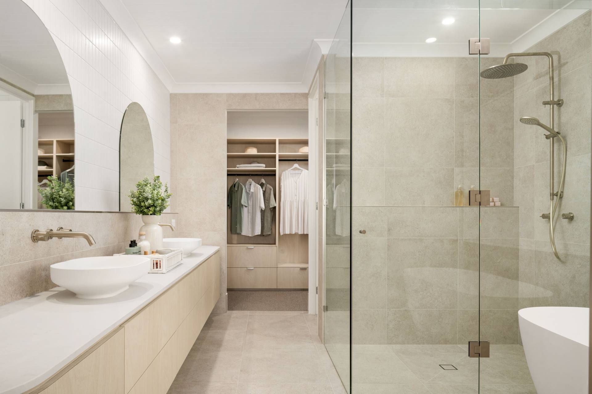 • Ensuite complete with floor-to-ceiling tiles, double vanity, feature mirrors, large shower, and bath