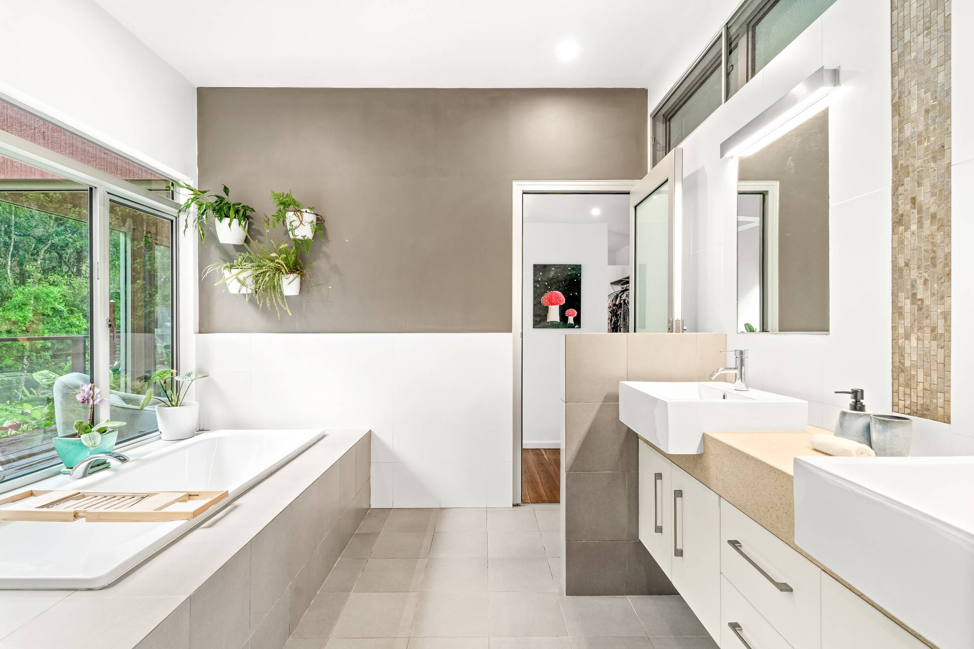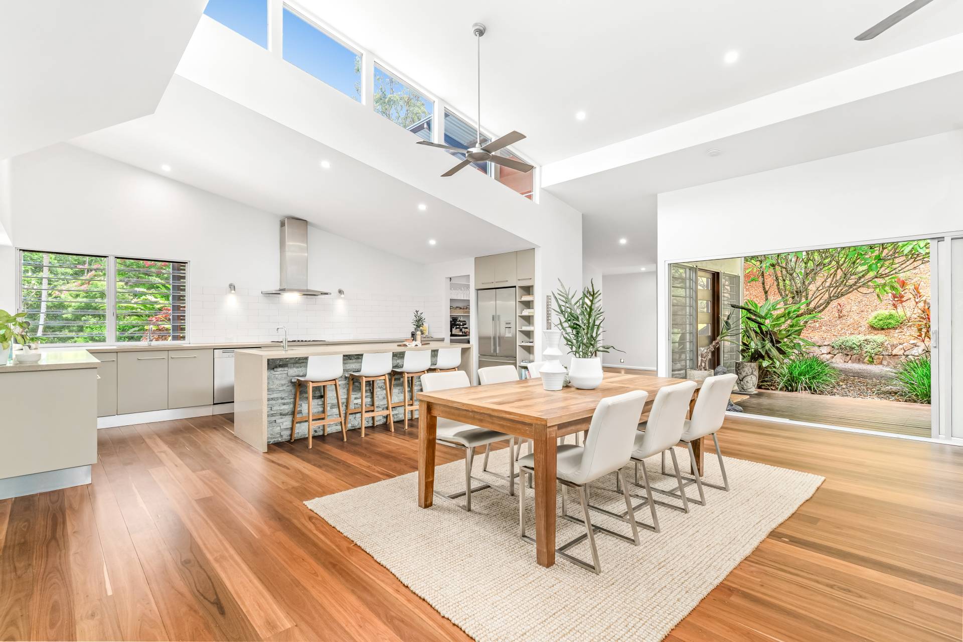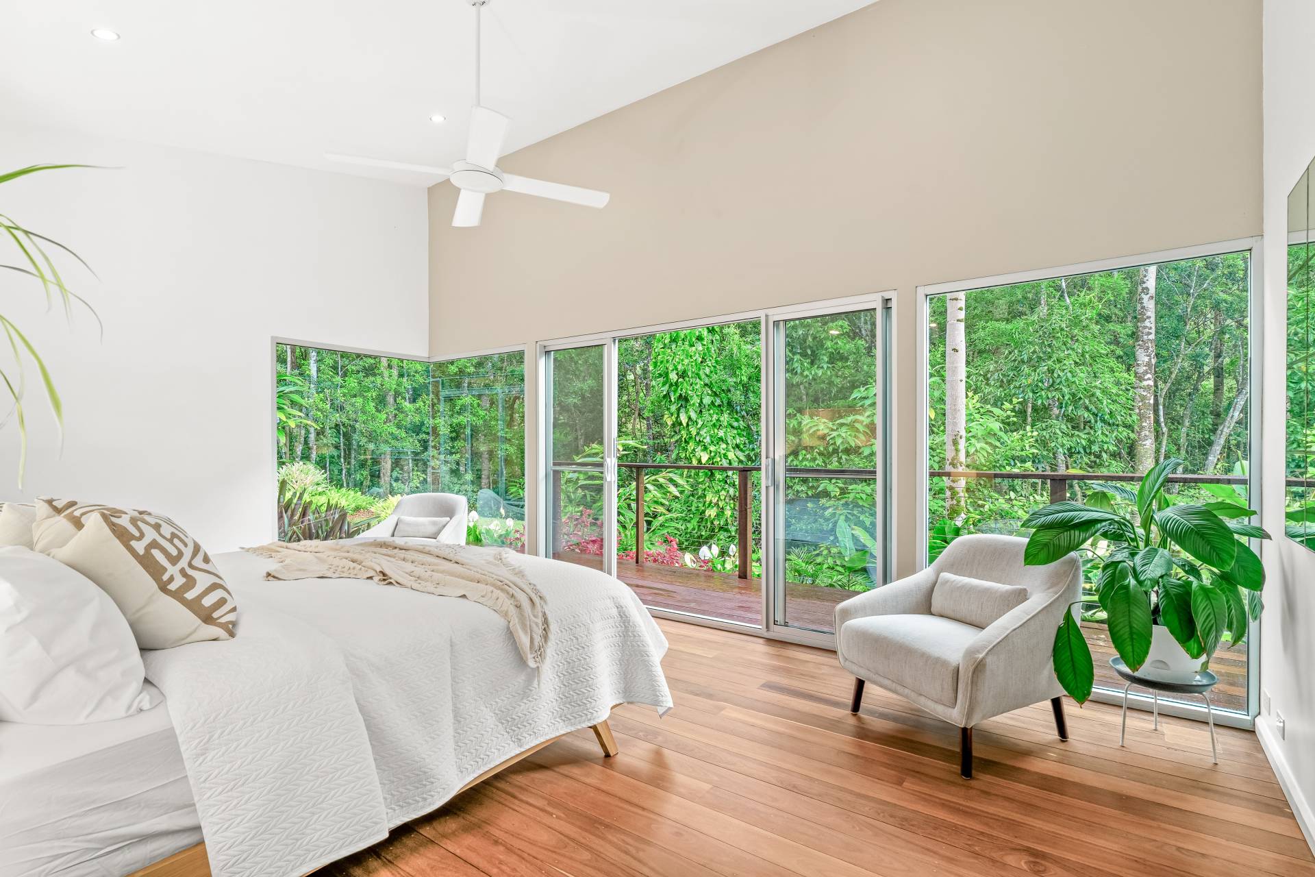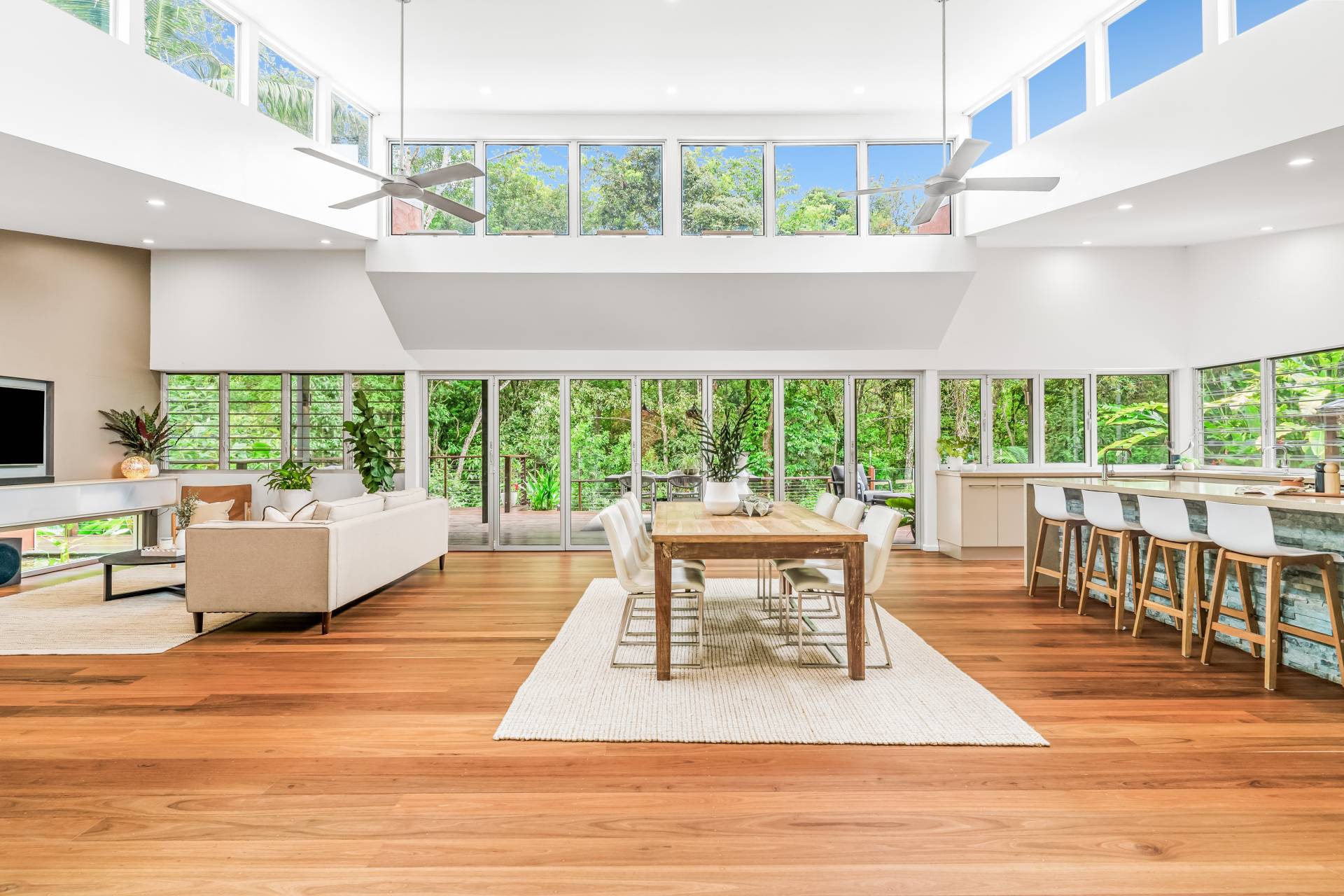 Just 5 minutes from Eumundi and 20 from Noosa, this bespoke home is north-east orientated to maximise light and airflow, with floor-to-ceiling glass and vaulted ceilings framing the rainforest outlook.