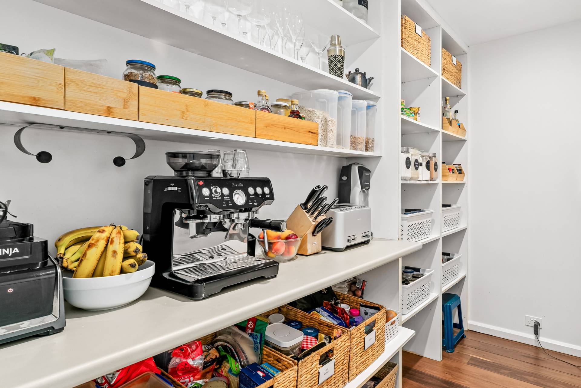 The contemporary kitchen with walk-in butler's pantry encompasses a large central sit-up island, Caesarstone benchtops, Miele appliances, gas cooktop and excellent prep and storage space.