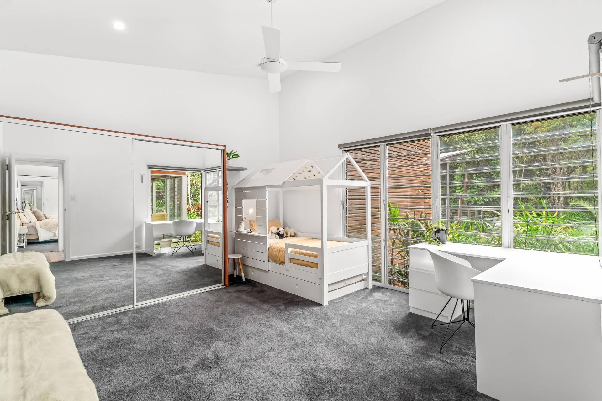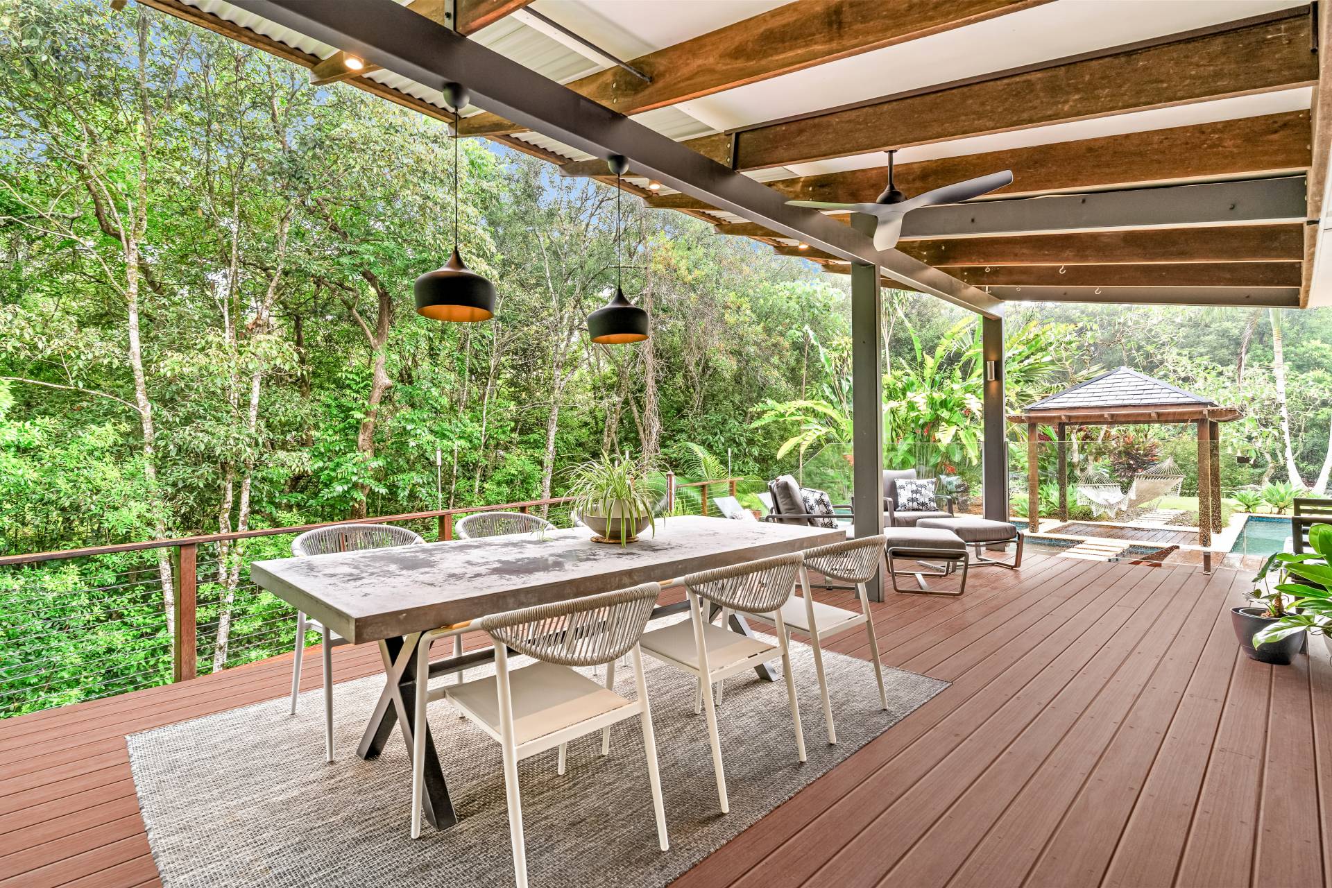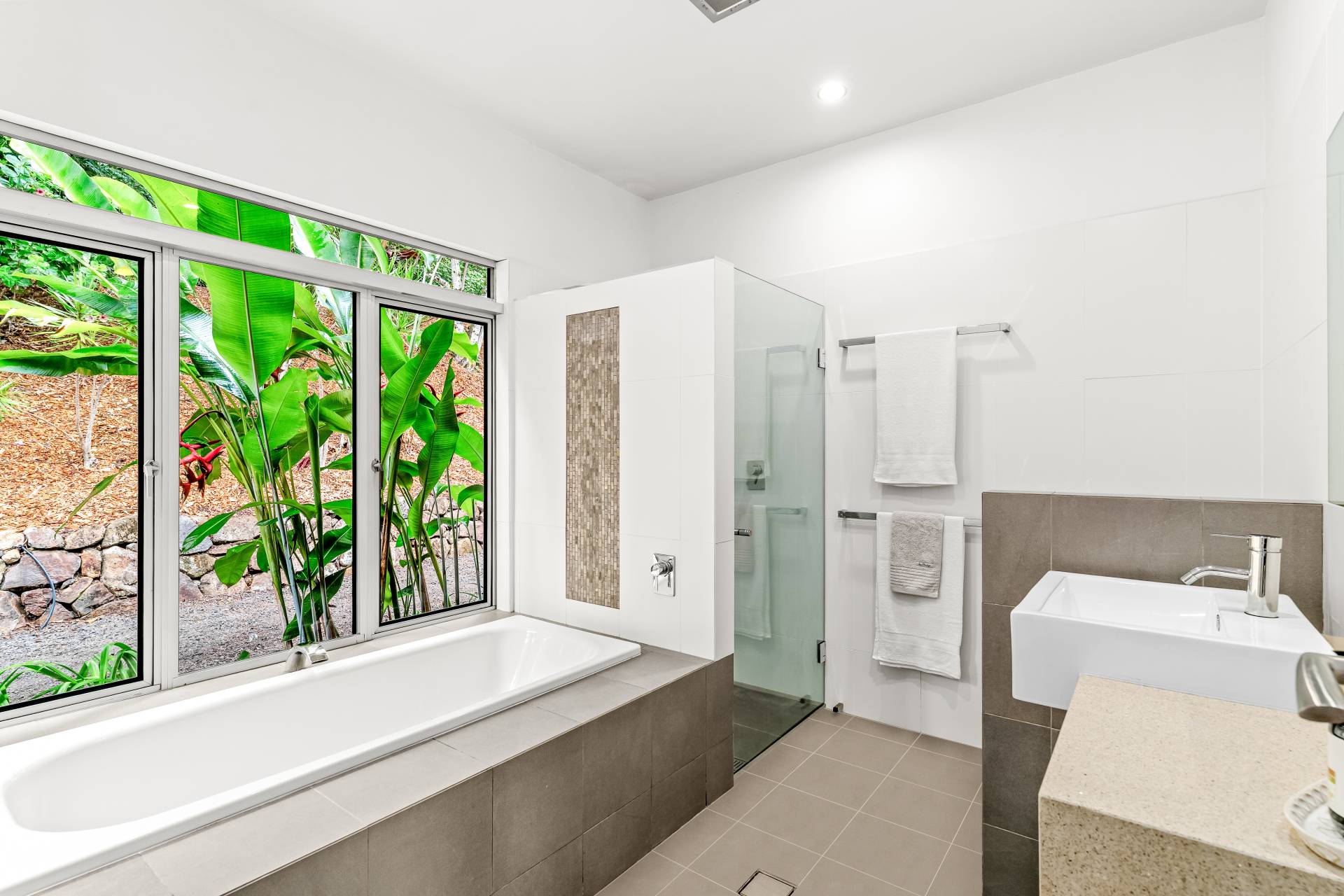 This architect-designed hideaway, accessed along a winding driveway and boasting a spacious separate apartment, invites you to live peacefully and sustainably within a five-acre haven of gardens and rainforest.
