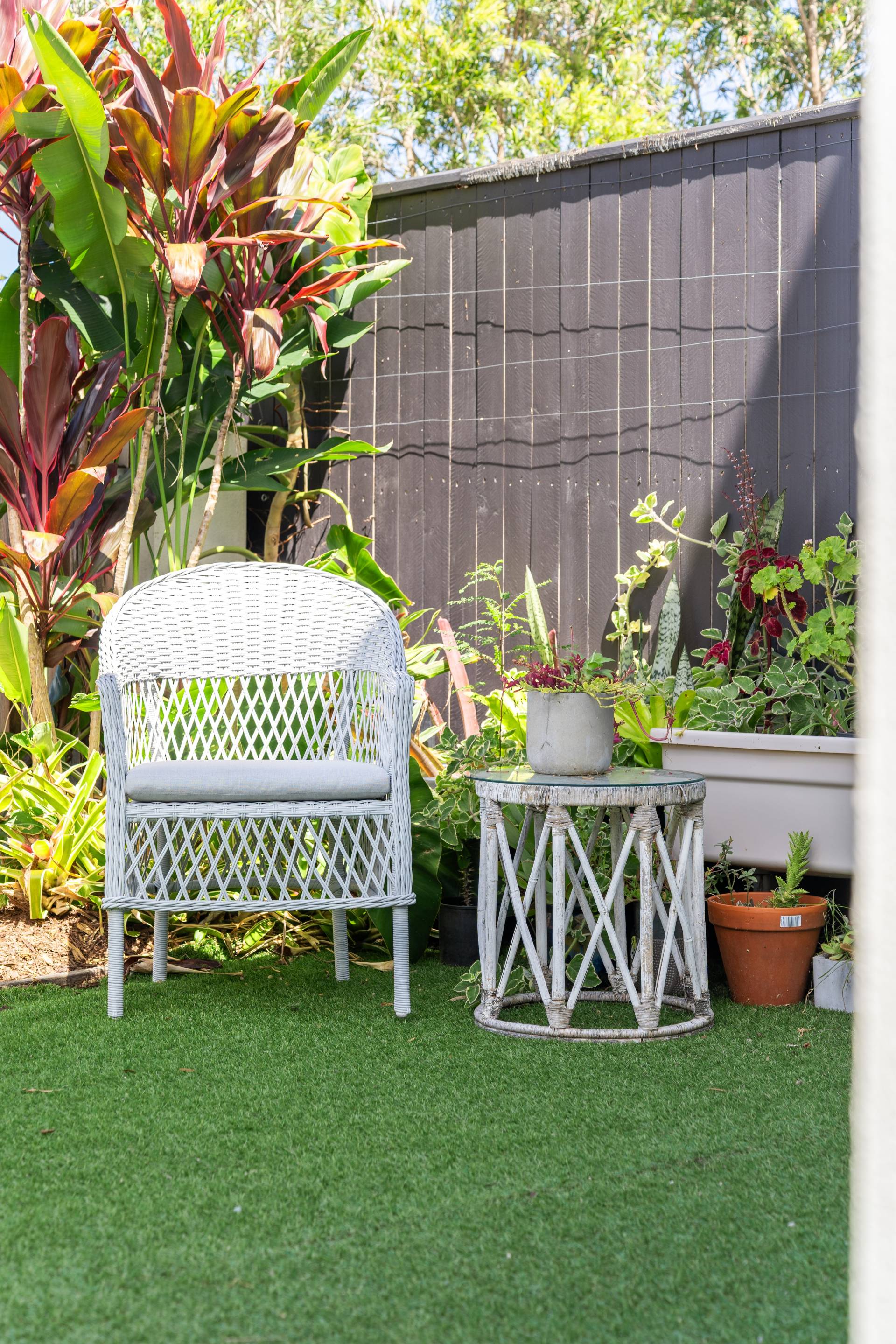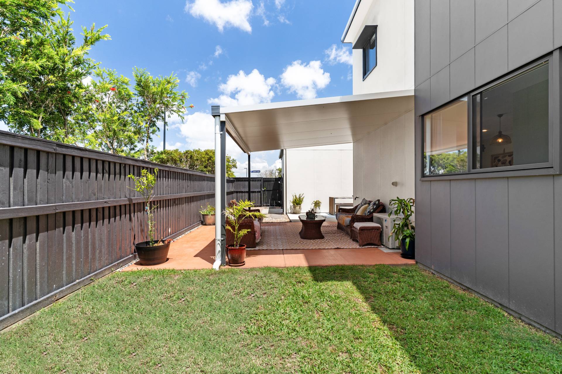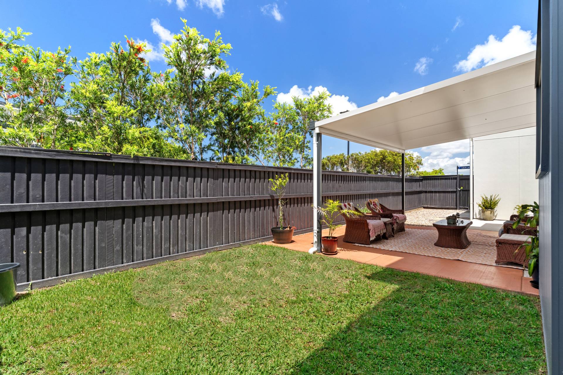 The covered alfresco pergola creates a seamless connection between indoor and outdoor living, offering a comfortable space to entertain or unwind while overlooking the yard.