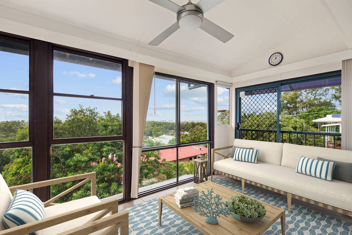 Upstairs, the open-plan living and kitchen areas flow out to an enclosed verandah with floor-to-ceiling windows overlooking the Sunshine Coast hinterland to the coast.
