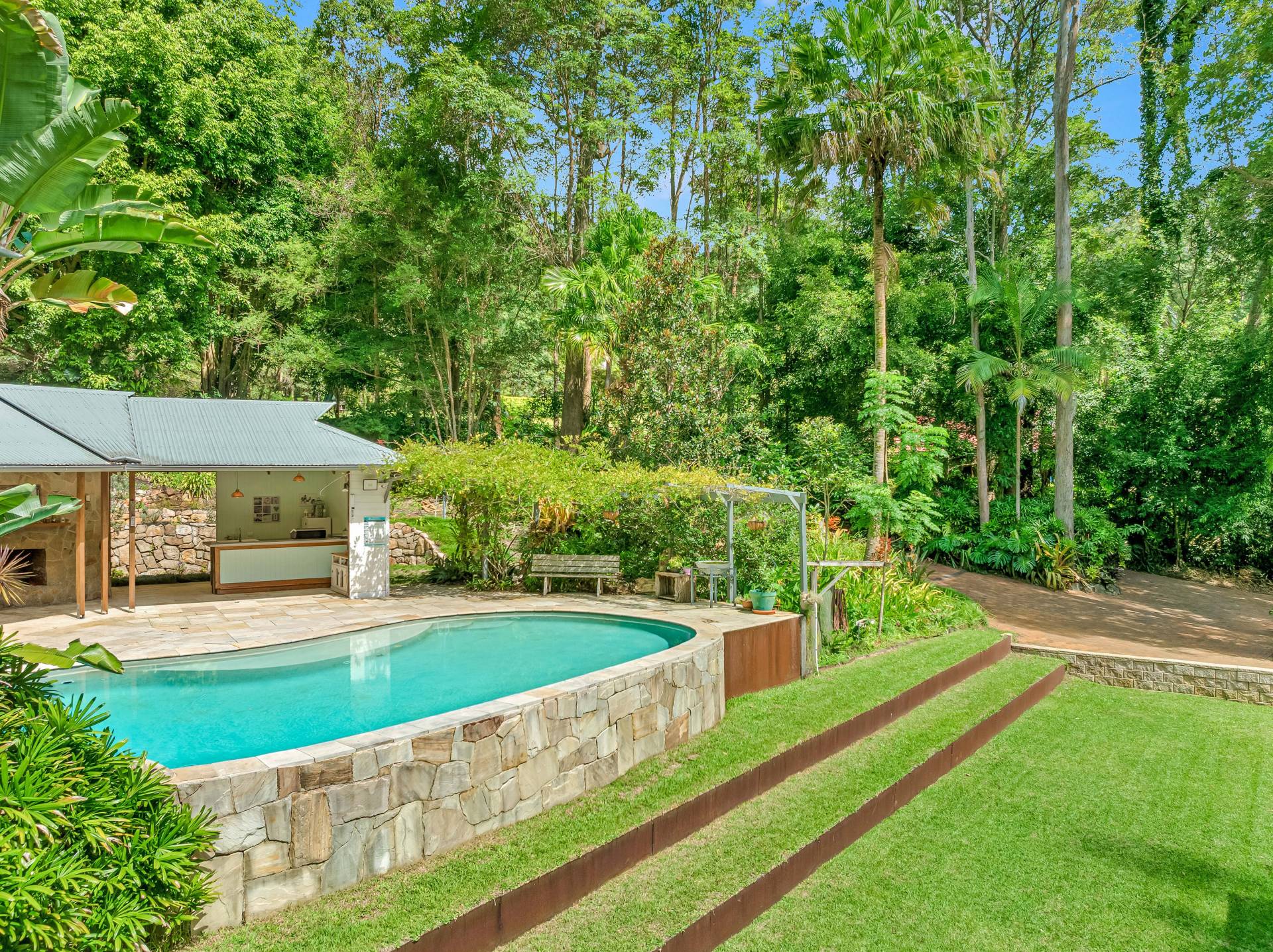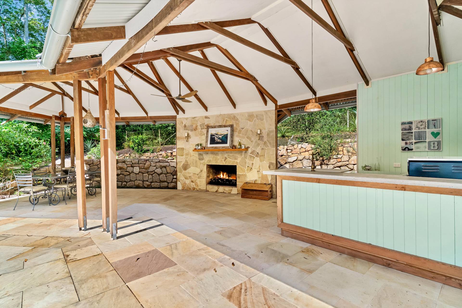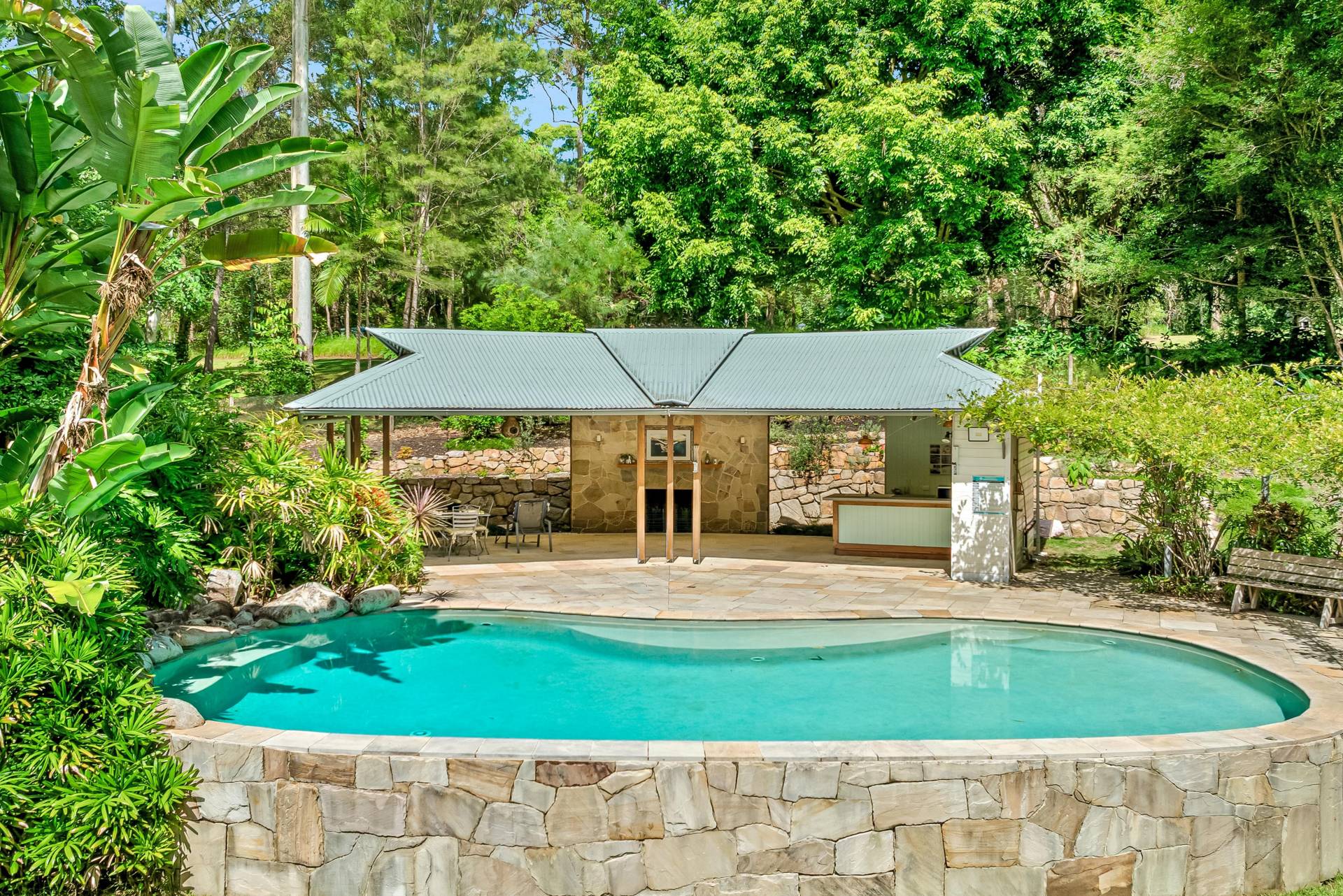- Gorgeous 11 x 5m landscaped saltwater pool with entertaining pavilion featuring a stone fireplace and bar, plus toilet and outdoor shower