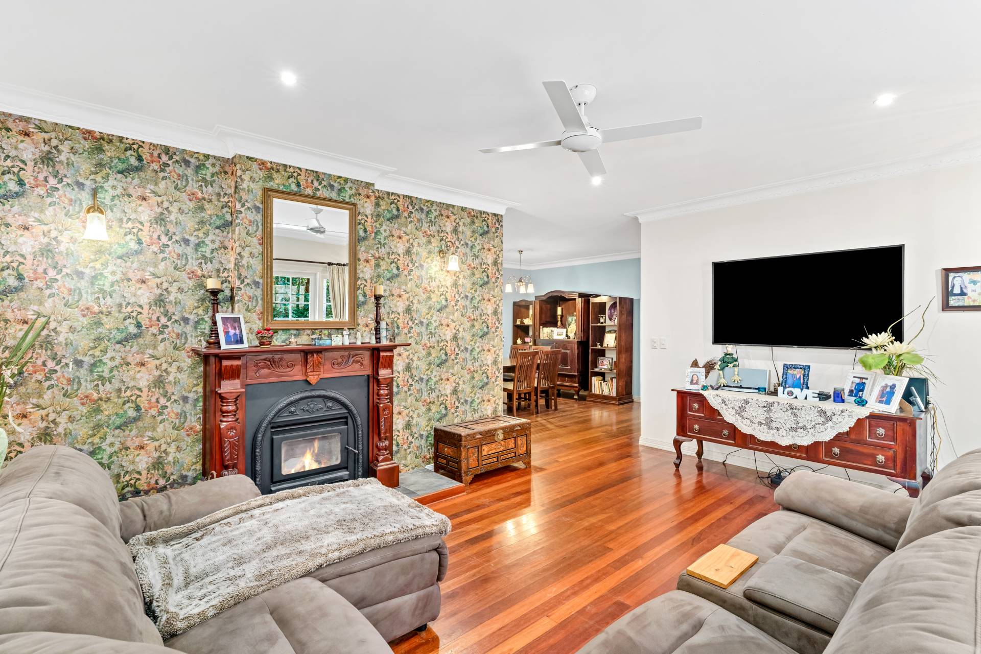 Across the main house, the central living area offers a sizeable lounge and feature fireplace, flowing out through double doors to the sunny rear deck.