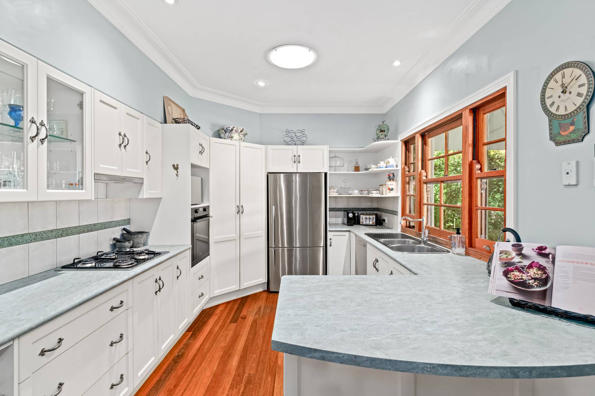 The country kitchen and adjoining dining space look out over the front garden, the kitchen embracing gas cooking, a Westinghouse wall oven, dishwasher, double sinks and sit-up bench.