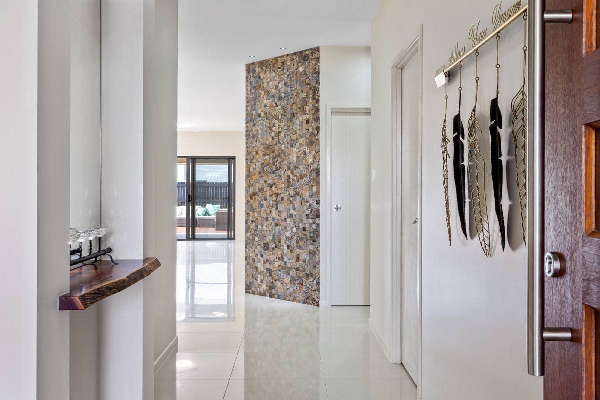 A high-ceilinged hallway leads into the large open plan living, dining and kitchen space at the heart of the home. Stylish ceramic floor tiles run throughout the central area and the impressive kitchen boasts walk-in pantry, stainless appliances, quality cabinetry and stone benchtops.