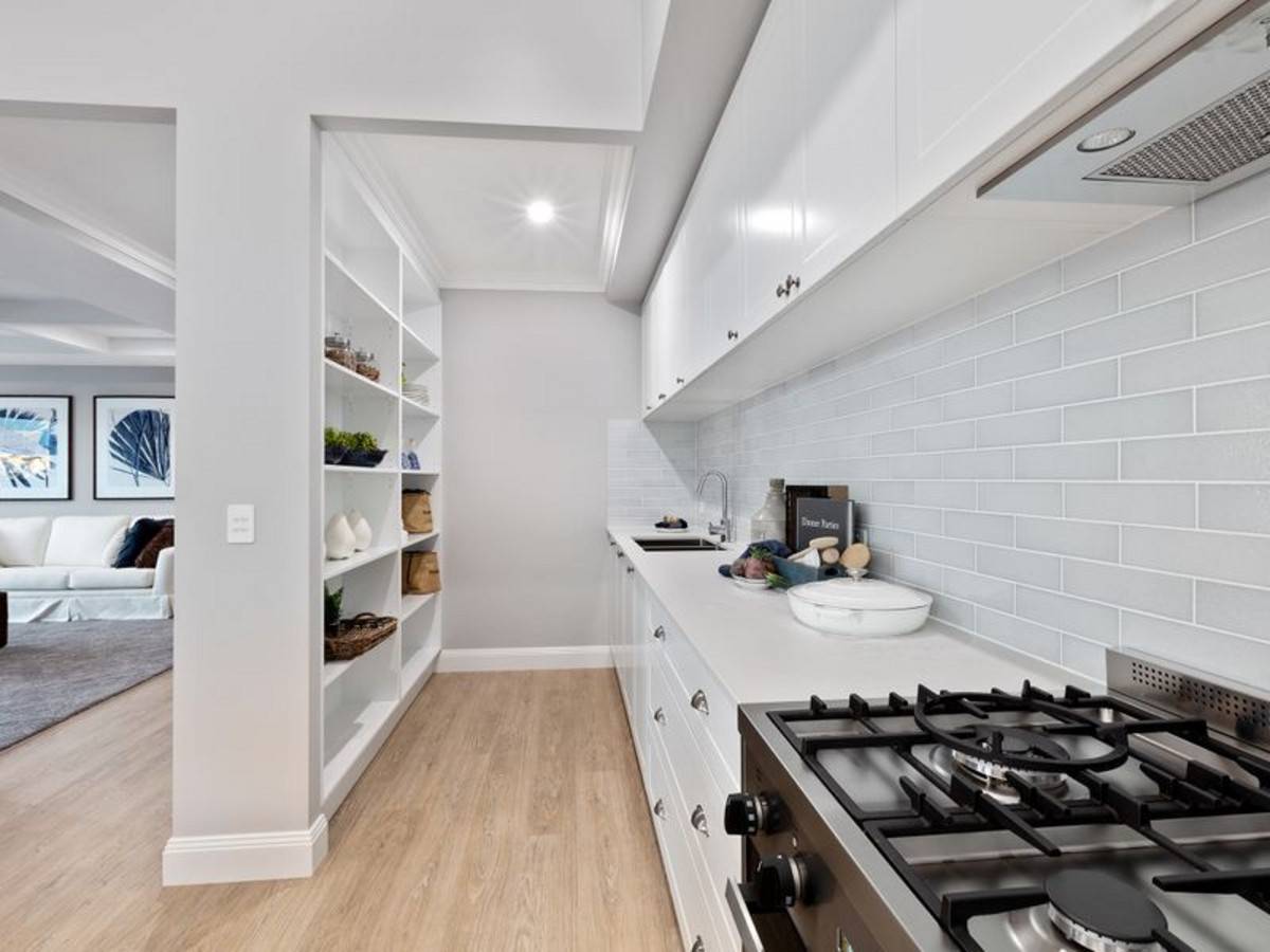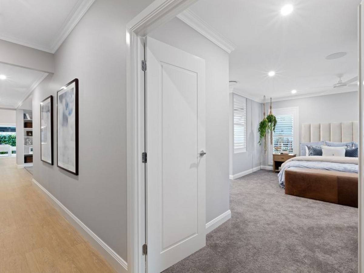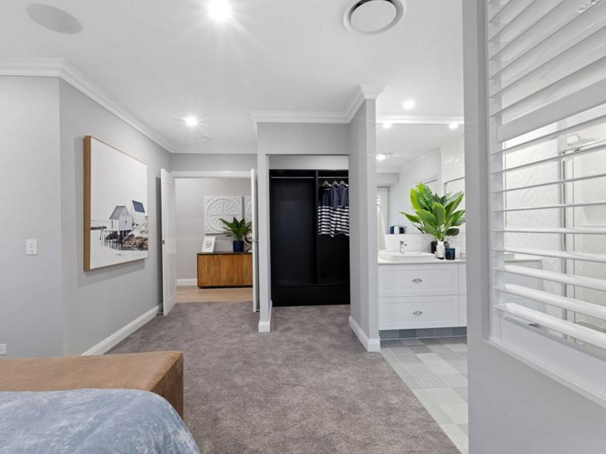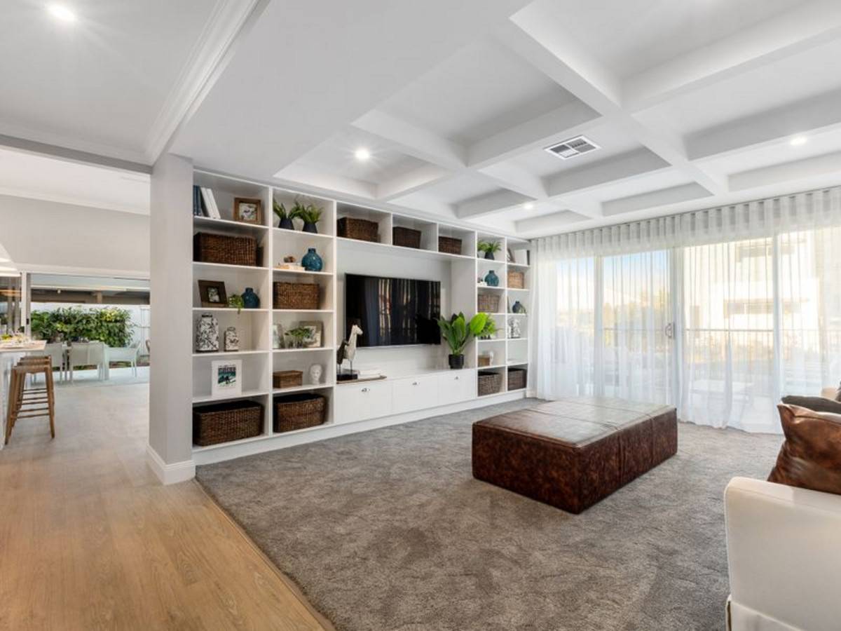 Entering into the foyer and study, wide hallways entice you through to the expansive main living space. The heart of this home boasts high ceilings with windows masterfully featured in the extra height capturing the light and emphasising the luxury of space. This main living space is masterfully arranged in an open-plan, comprising of kitchen, dining and family room. Sliding doors stack back to unfurl an extended grand alfresco overlooking the pool. The contemporary kitchen spares no luxury, complete with large island bench, modern appliances, bespoke finishes and butlers pantry. The separate lounge boasts access to the courtyard, built-in shelving and coffered ceiling that further adds a sense of sophistication and elegance.