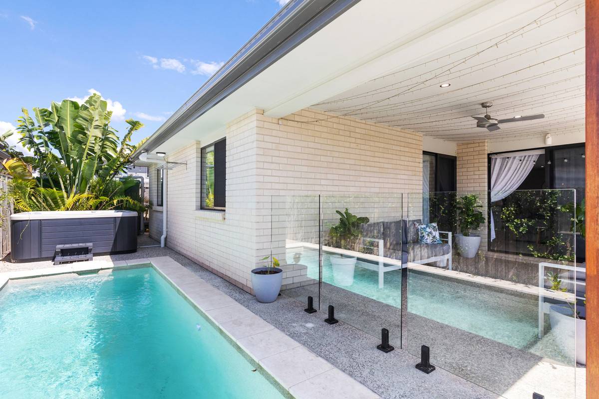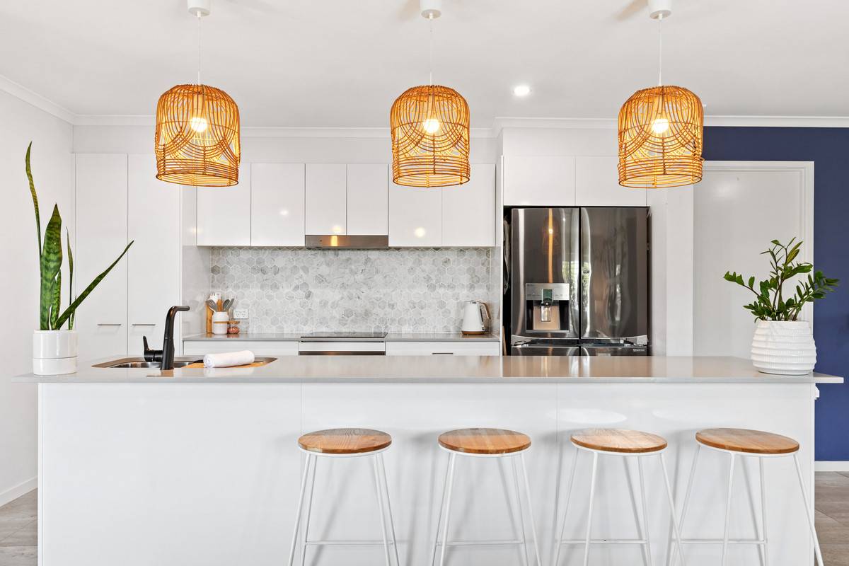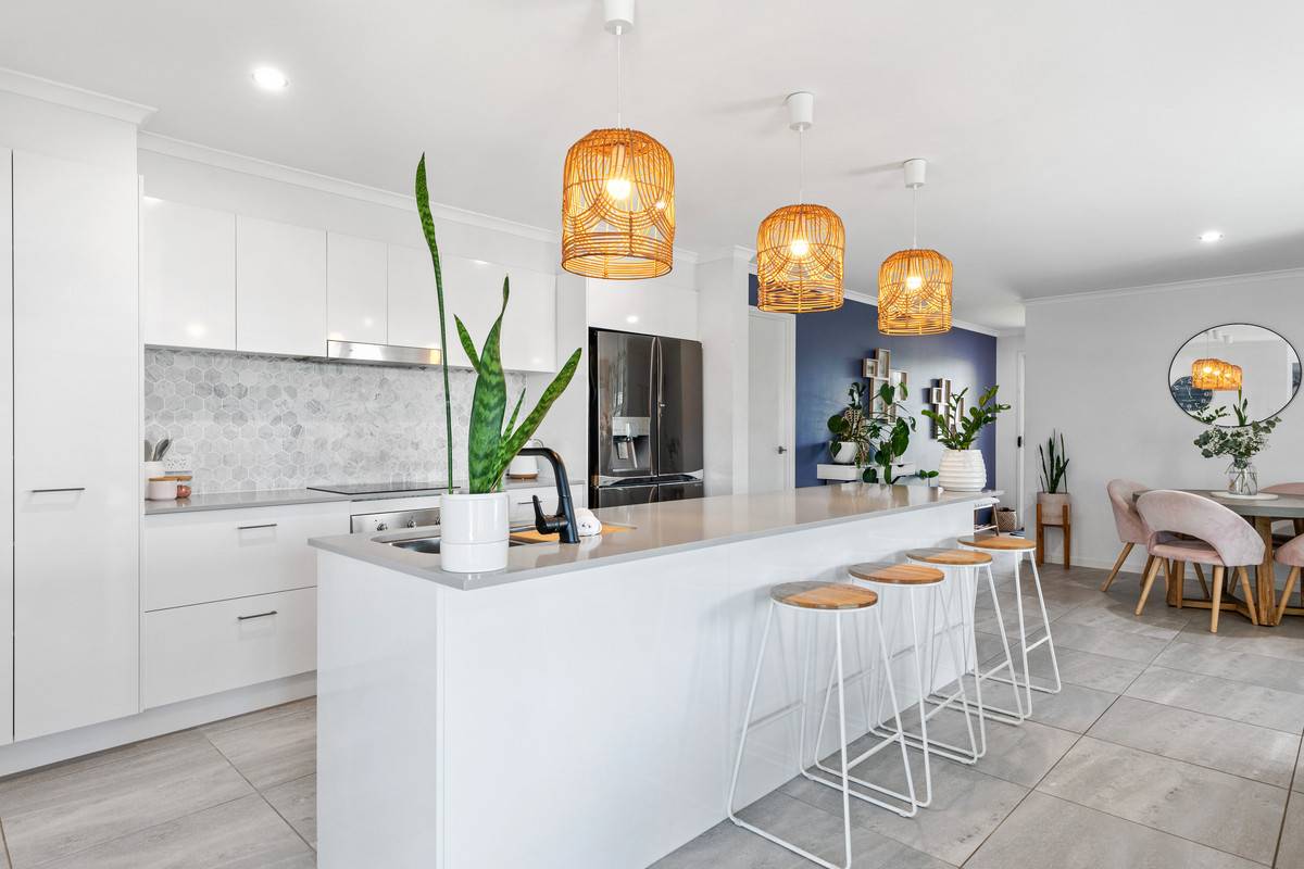 The open-plan interior offers space and natural light, while luxurious textures and refined finishes create a welcoming and tranquil living that flows outdoors to the alfresco. The kitchen boasts reconstituted stone bench tops, modern appliances and ample cupboard and counter space complimented by a feature tile splashback and beautiful pendant lighting. Large glass sliding doors and windows offer natural light and breeze ways through the home as well as inviting views to the stunning outdoors. The covered alfresco offers multiple zones with space for dining, sun lounge and relaxing by the magnesium pool. A spa is surrounded by leafy, green established plants providing a hidden sanctuary in this private outdoor entertaining. This contemporary home combines a masterfully designed floorplan with modern finishes, offering an unrivalled property equipped for a life of style and functionality.
