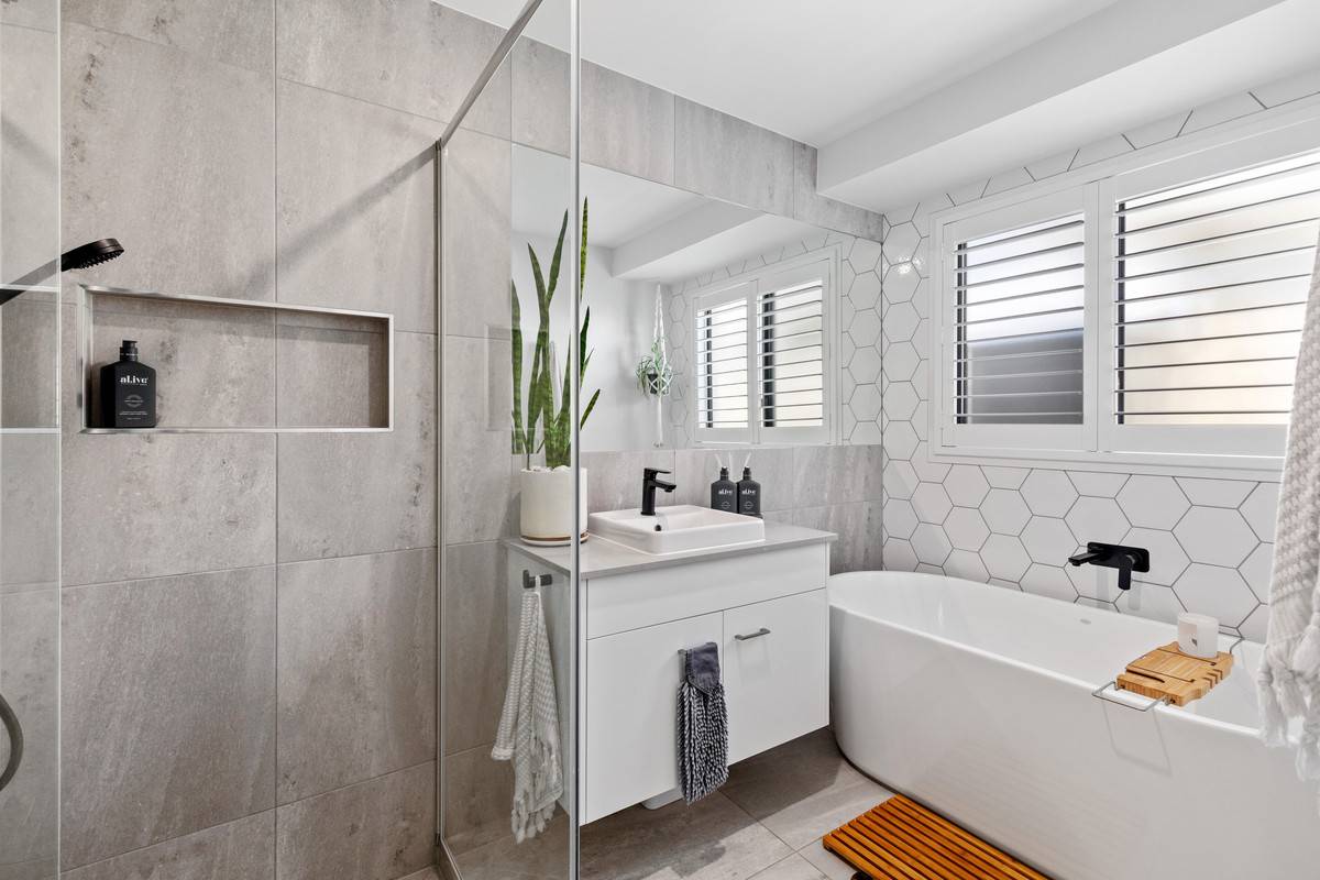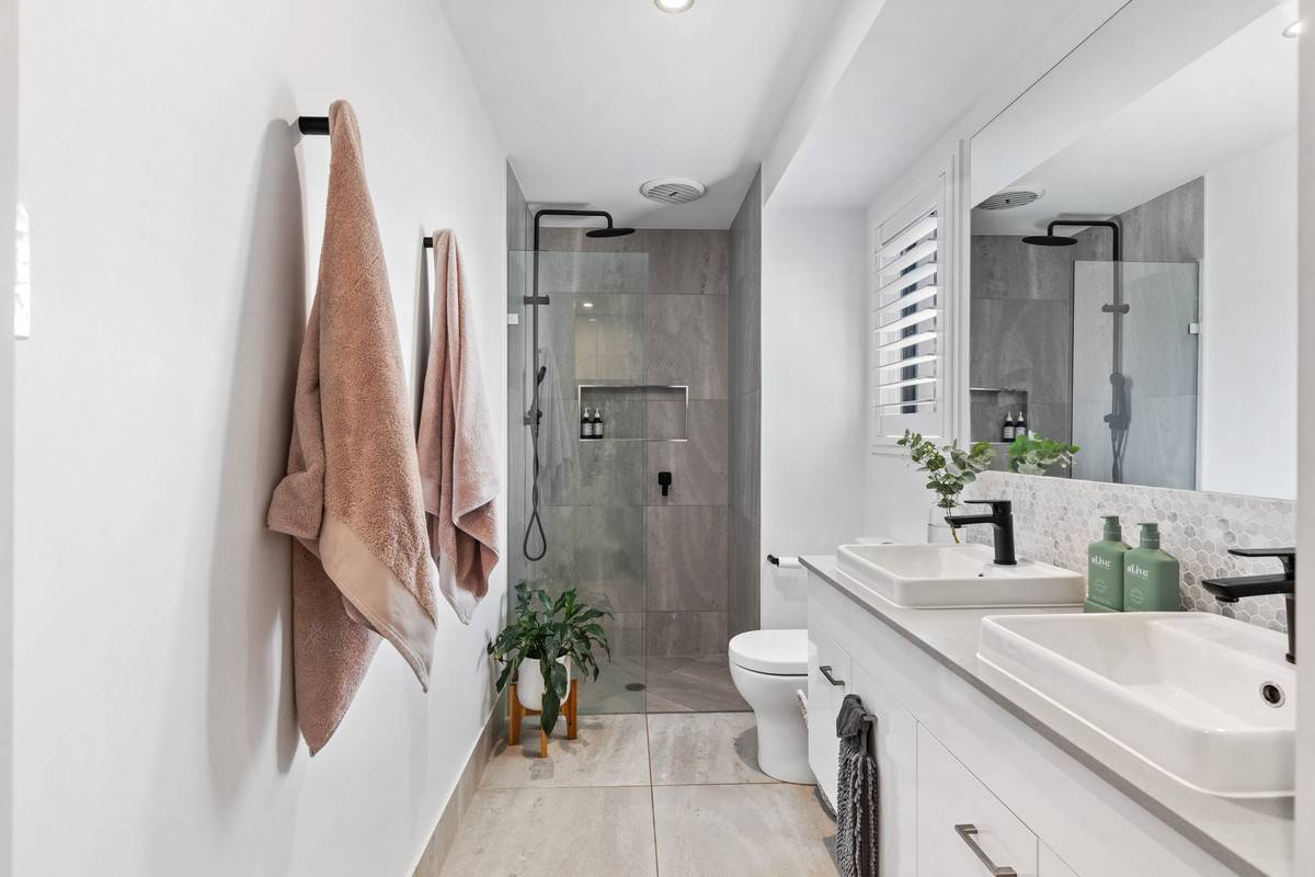 - Both bathrooms benefit from shower niche, floor-to-ceiling tiles, plantation shutters, black feature at-ware & fittings