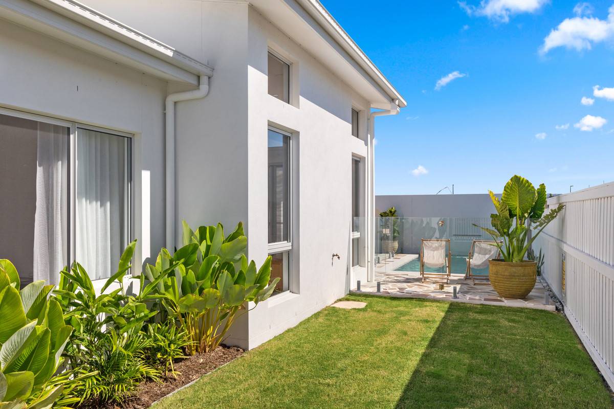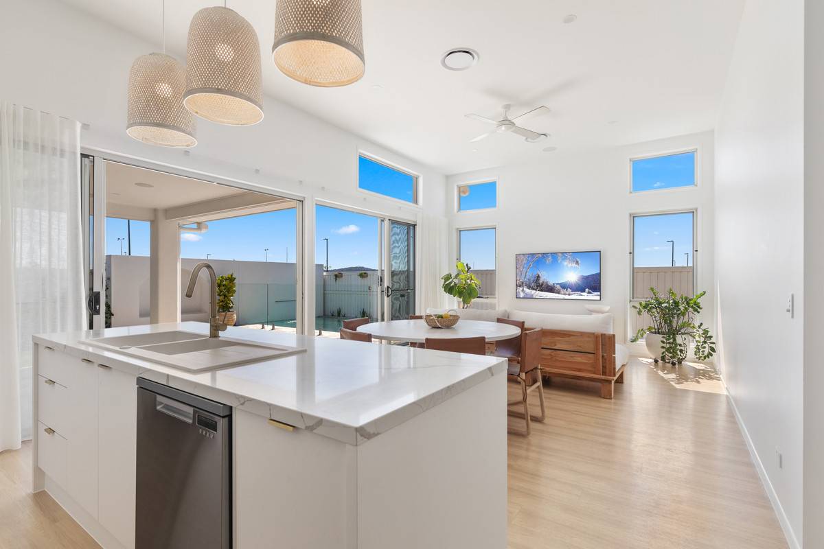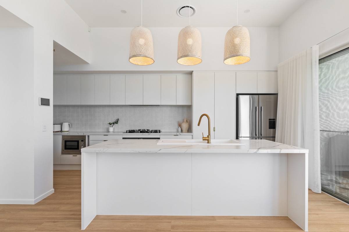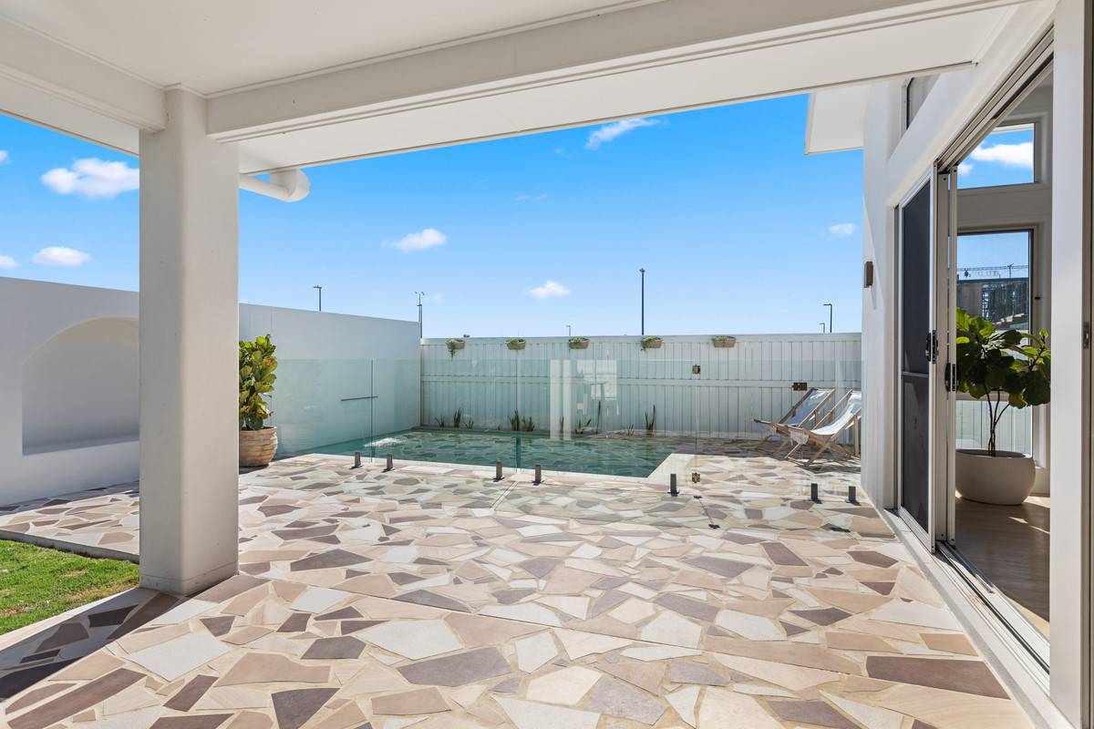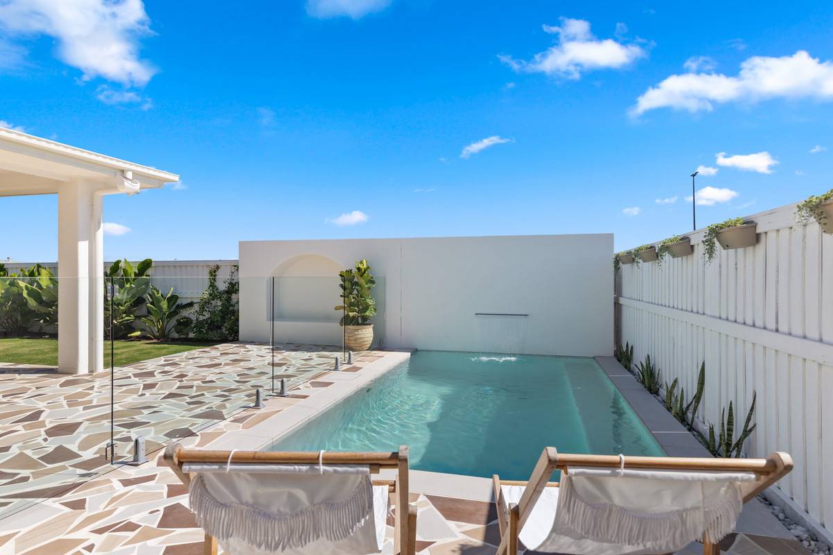 Entering the property via a covered patio with mosaic flooring and bold, gold, arched, double doors, this stunning home makes a lasting first impression. This large 546sqm corner block offers complete privacy having only one neighbour! Wide hallways and a stunning palate of wood effect flooring, crisp whites, and gold finishes entice you through to the expansive main living space. The heart of this home boasts high ceilings with windows masterfully featured in the extra height capturing the light and emphasising the luxury of space. This main living space is arranged in an open-plan, comprising kitchen, dining and lounge. Sliding doors stack back to unfurl an extended grand alfresco continuing the mosaic patio flooring. Fully landscaped with established leafy plants, complete with water feature over the glistening pool. There is even an in-built wall seat to soak up the sun and enjoy the splendour that is your home! The contemporary kitchen spares no luxury, complete with large island bench, marble effect waterfall bench tops, modern appliances, insinkerator, bespoke finishes and walk-in pantry. Rattan pendant lighting distinguishes the space and compliments the natural tones.