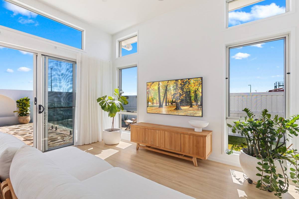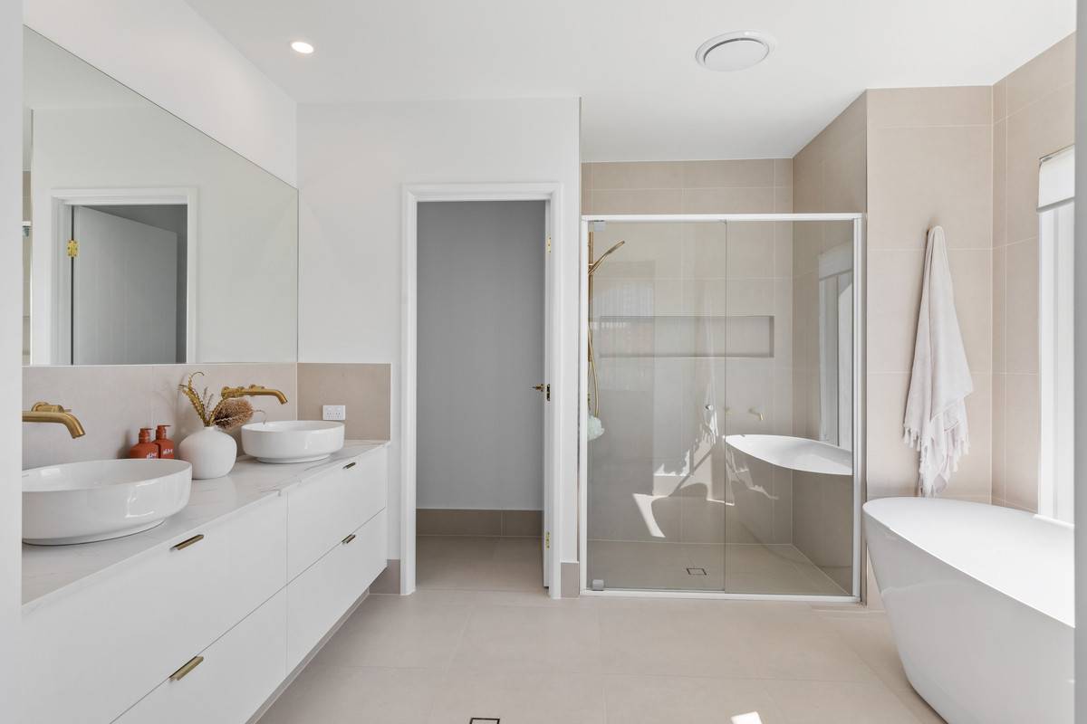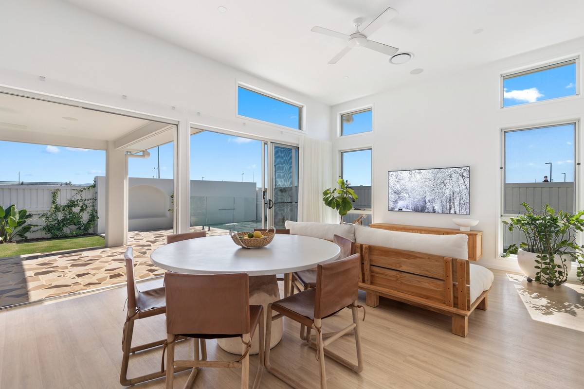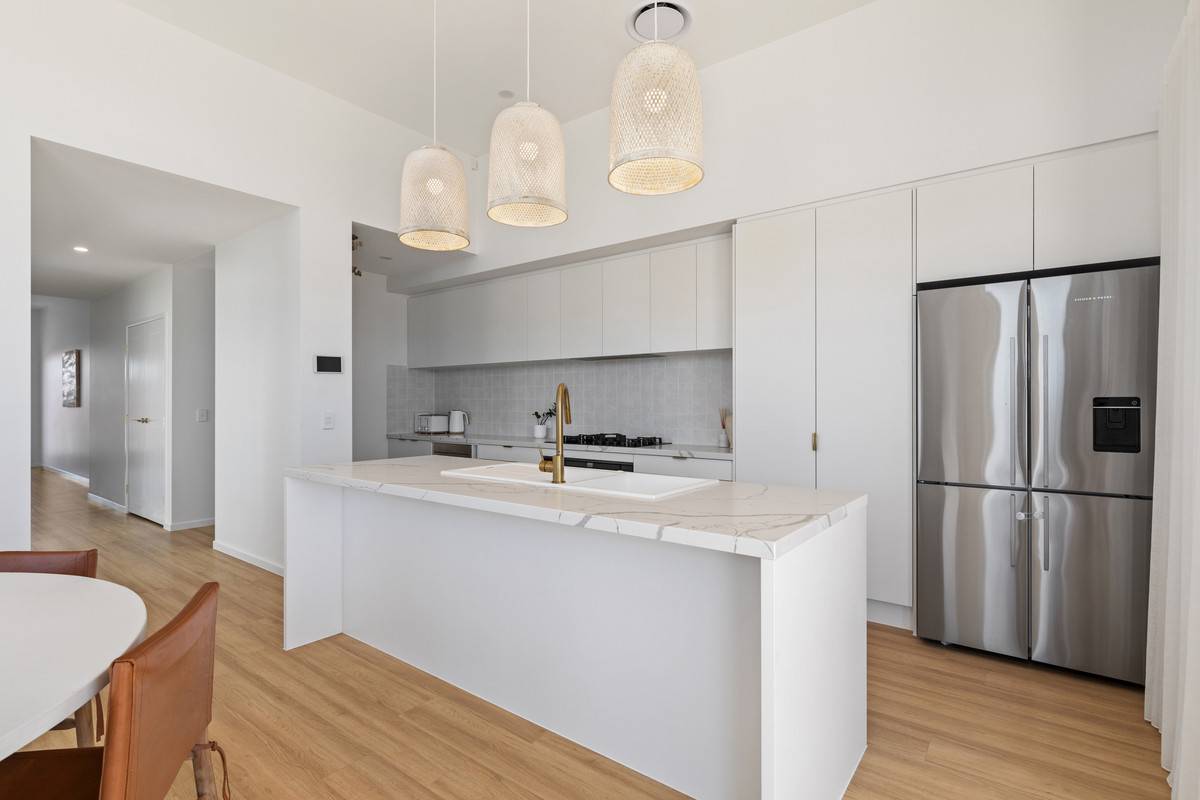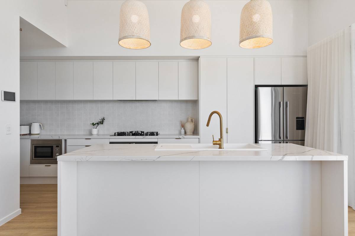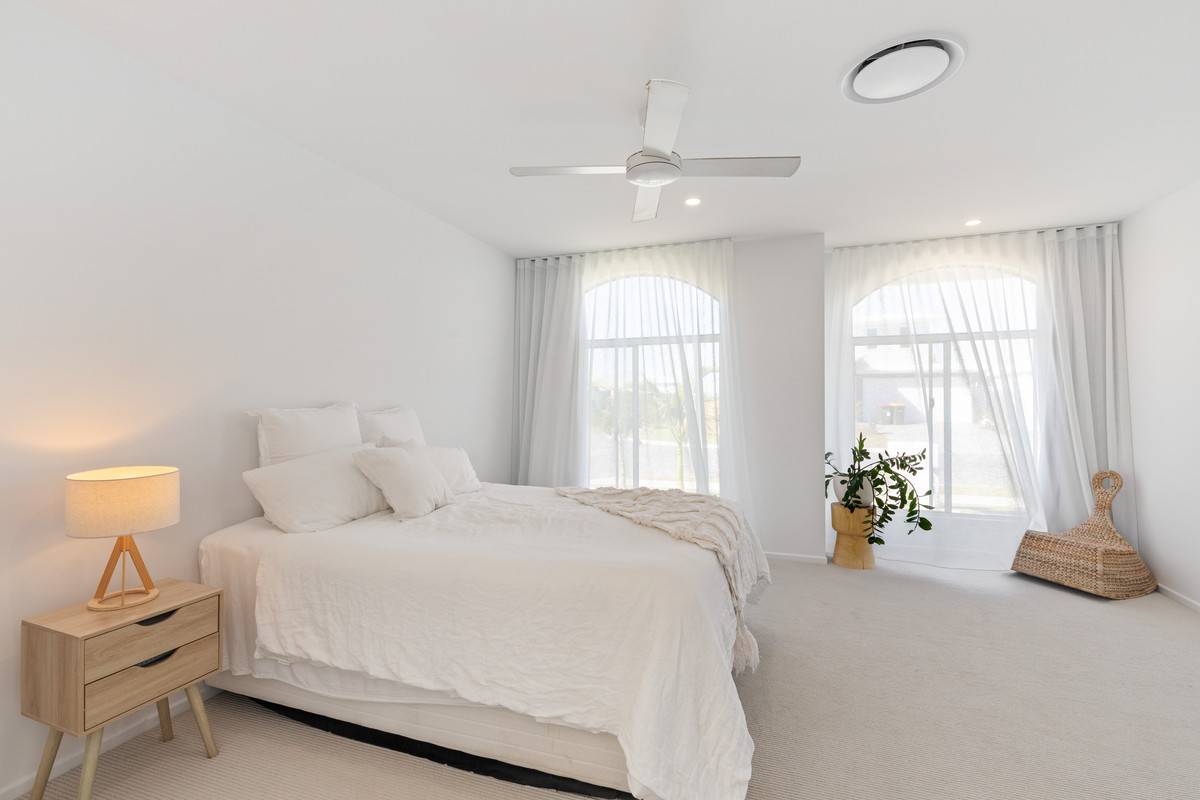 Entering the property via a covered patio with mosaic flooring and bold, gold, arched, double doors, this stunning home makes a lasting first impression. This large 546sqm corner block offers complete privacy having only one neighbour! Wide hallways and a stunning palate of wood effect flooring, crisp whites, and gold finishes entice you through to the expansive main living space. The heart of this home boasts high ceilings with windows masterfully featured in the extra height capturing the light and emphasising the luxury of space. This main living space is arranged in an open-plan, comprising kitchen, dining and lounge. Sliding doors stack back to unfurl an extended grand alfresco continuing the mosaic patio flooring. Fully landscaped with established leafy plants, complete with water feature over the glistening pool. There is even an in-built wall seat to soak up the sun and enjoy the splendour that is your home! The contemporary kitchen spares no luxury, complete with large island bench, marble effect waterfall bench tops, modern appliances, insinkerator, bespoke finishes and walk-in pantry. Rattan pendant lighting distinguishes the space and compliments the natural tones.