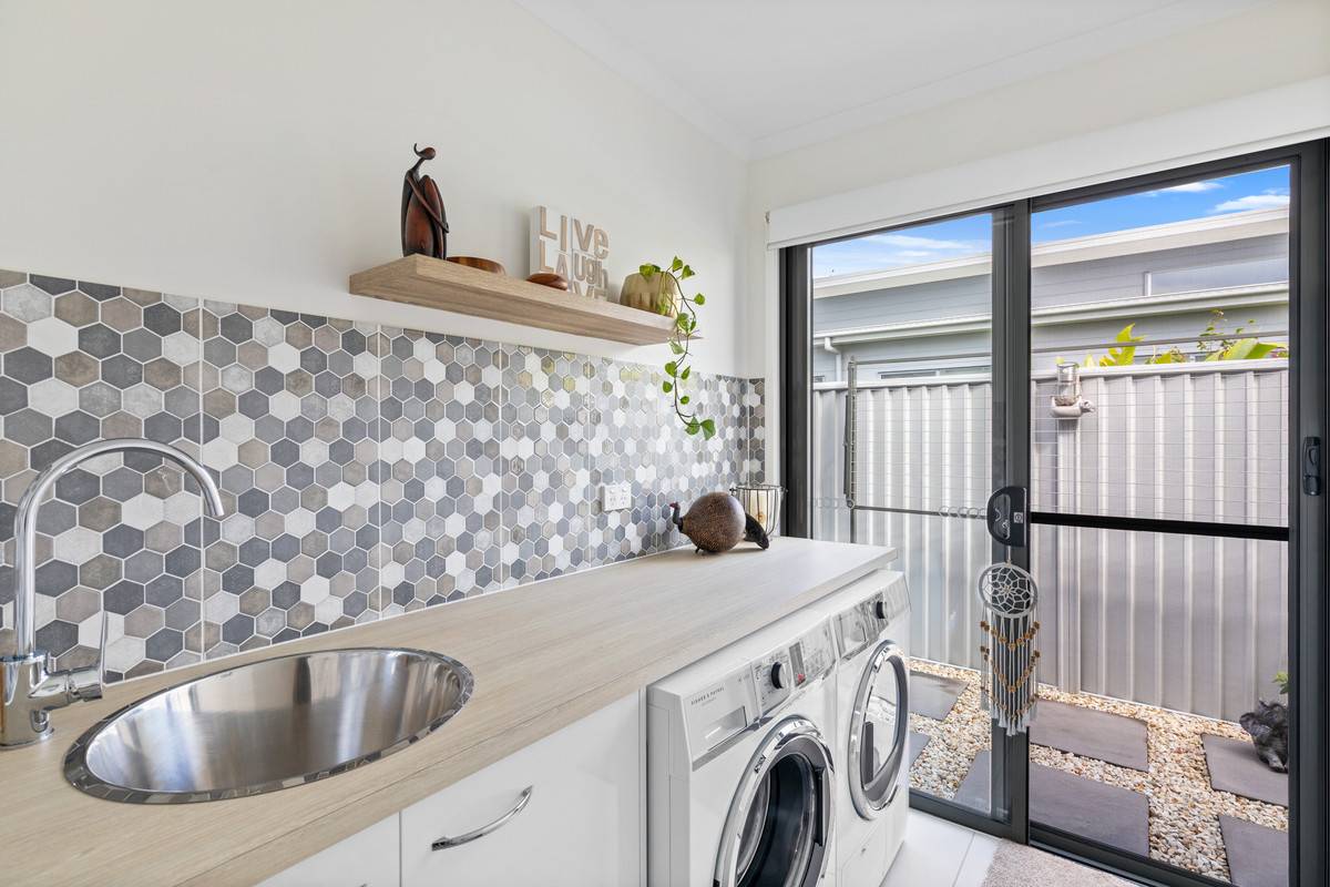Off the main living area, the main bathroom boasts bath, shower with niche and quality fittings as well as a separate powder room and washbasin. The laundry is conveniently located with nearby linen press and direct access to the outdoor drying area. The double lock up garage would comfortably fit two cars with fitted cabinetry and workbench. This beautiful home is ready to move into and start living!