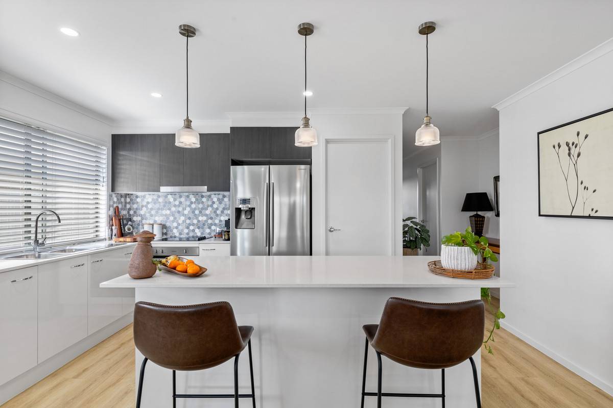 Impeccably presented, this property boasts an excellent floorpan with stunning outdoor living and large garden. Feel immediately at home in this family friendly, quiet street. Light-filled and breezy throughout, the open-plan kitchen, living and dining flows effortlessly with striking wood-effect vinyl planking and warm neutral tones. Enjoy the well-equipped kitchen with quality appliances, large walk in pantry, reconstituted stone bench-tops and a stylish hexagon splash-back. Pendant lighting beautifully frames the large kitchen island, creating an ideal place to create all things culinary while entertaining friends or family.